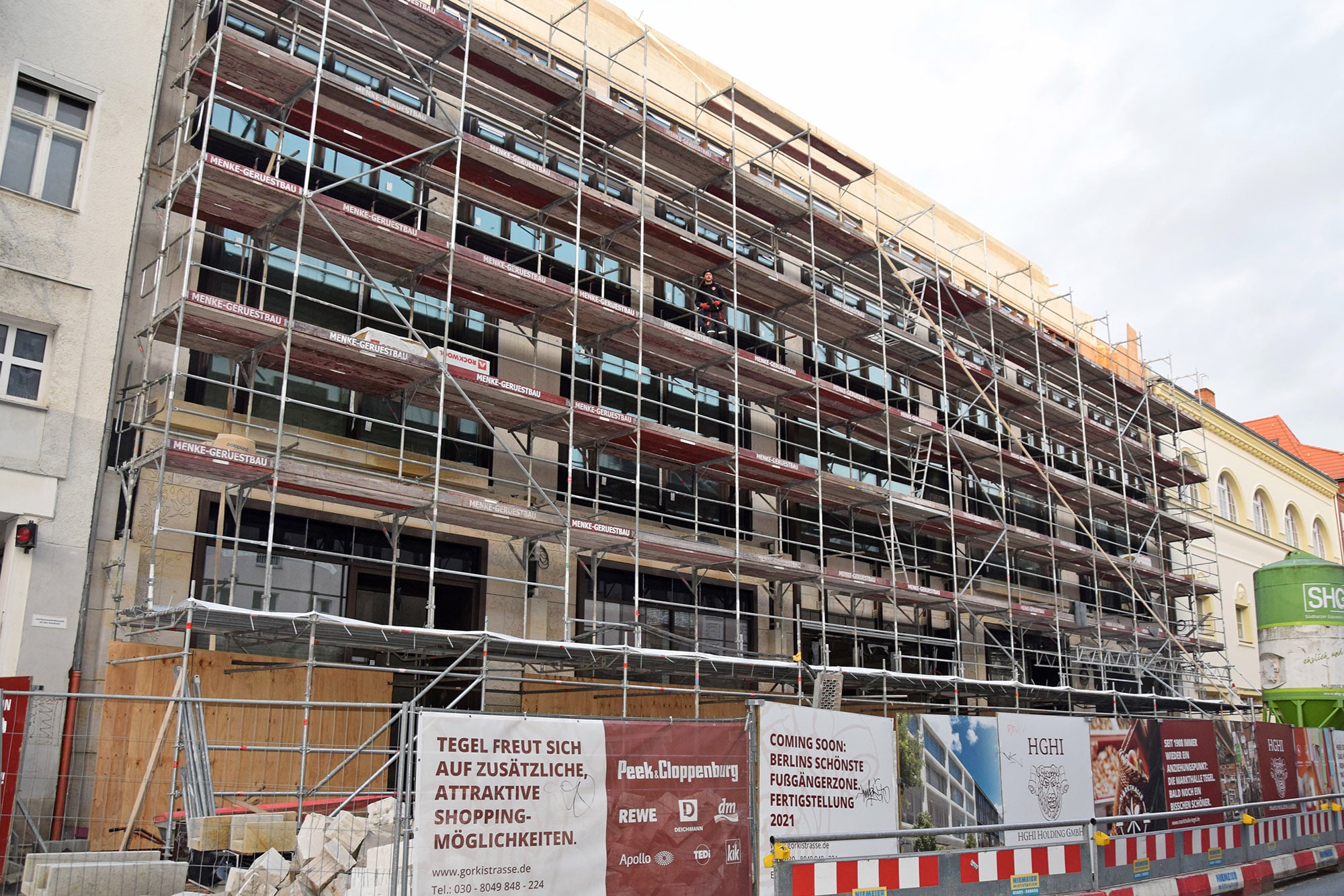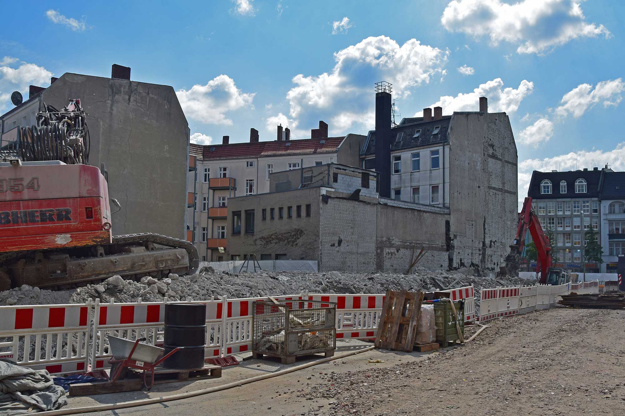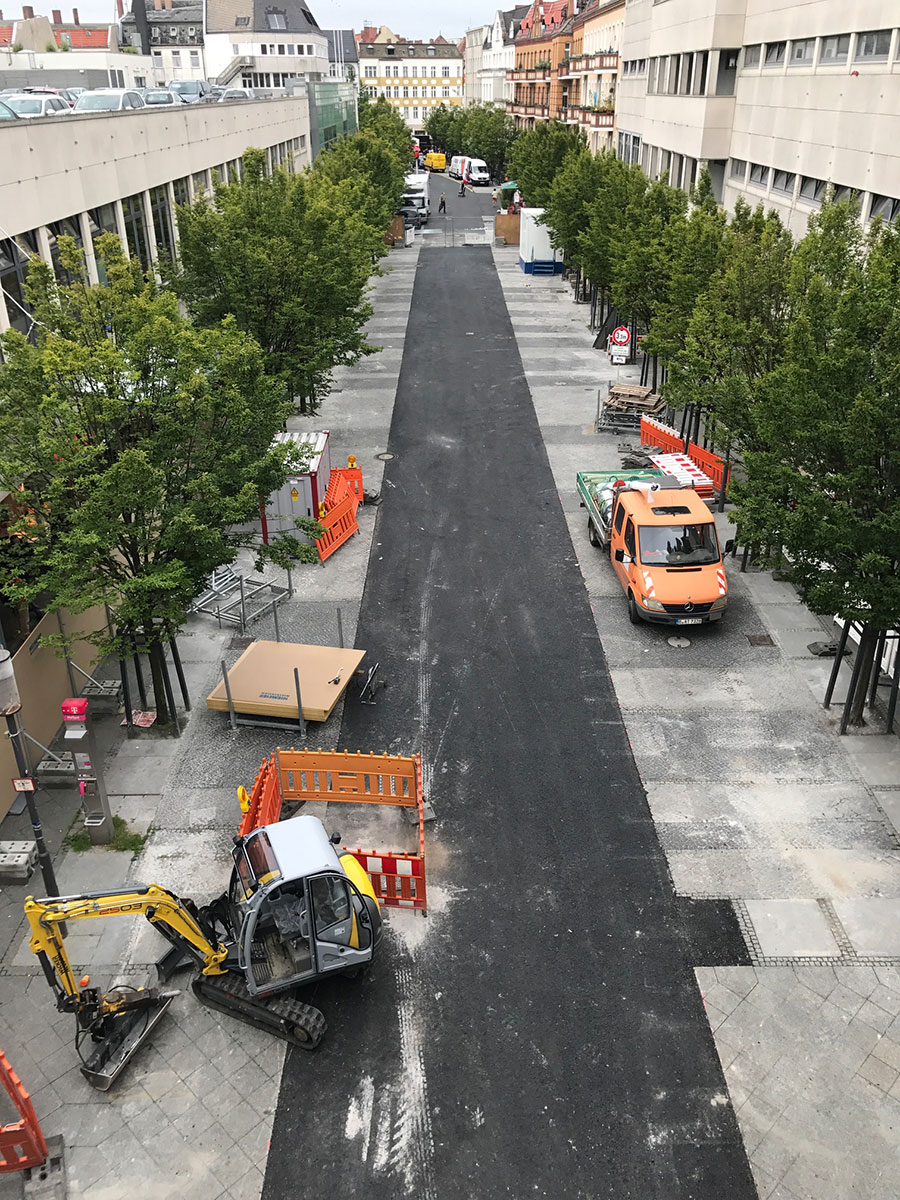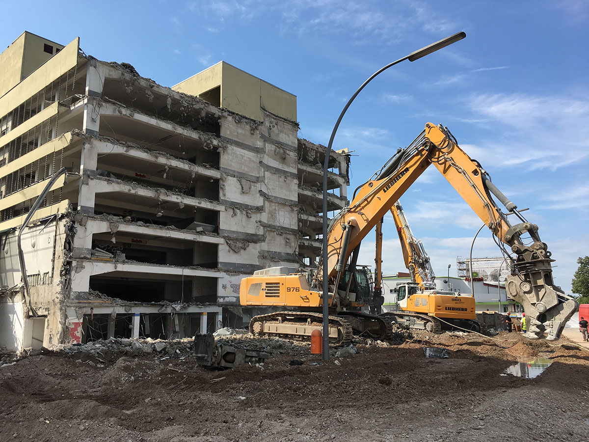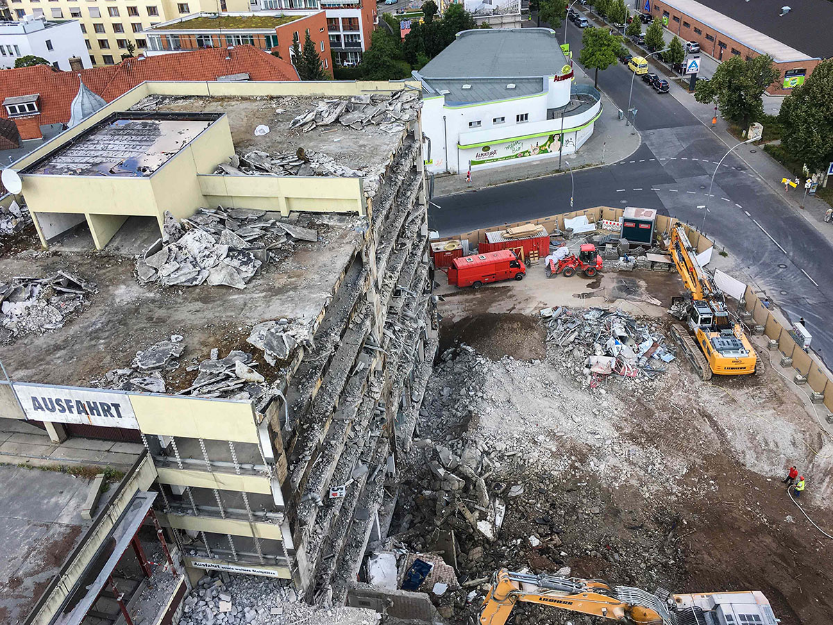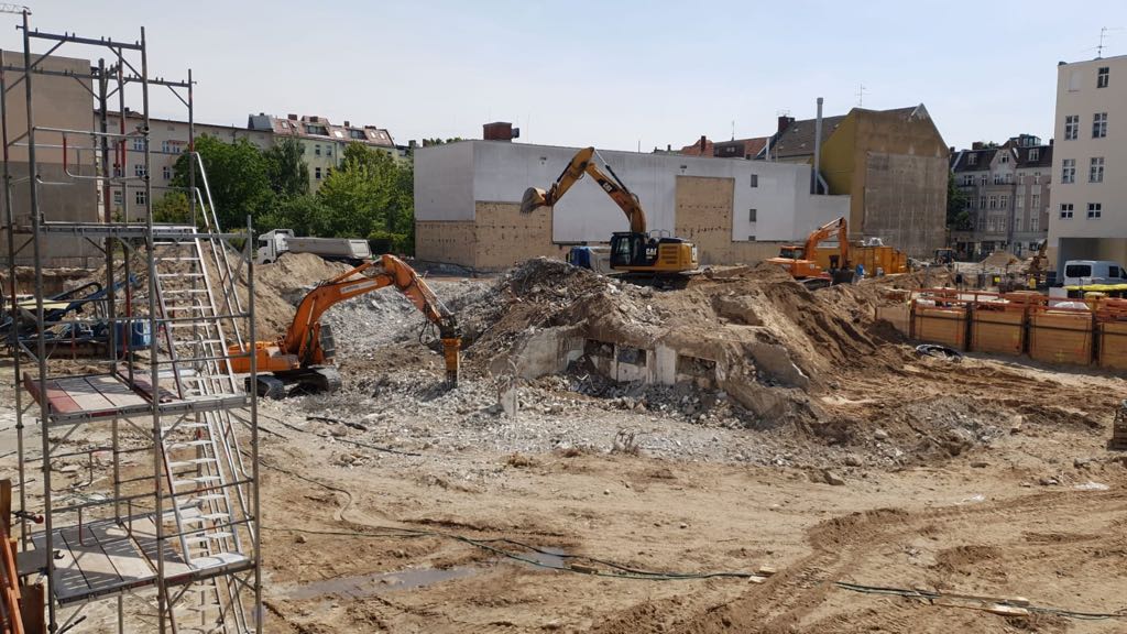 Es gibt große Neuigkeiten aus der Gorkistraße: Die Baustraße in der Fußgängerzone ist heute fertig geworden und der Bauzaun wurde aufgestellt. Unter dem Einsatz spezieller Technik starten am 31. Juli die Abbrucharbeiten des alten Parkhauses. Die Entkernungsarbeiten in diesem Bereich sind fast abgeschlossen. Als nächster Schritt in der Bauplanung steht die Baustelleneinrichtung für den Südteil des Areals in Tegel an. Auch hier haben die Entkernungsarbeiten bereits begonnen.