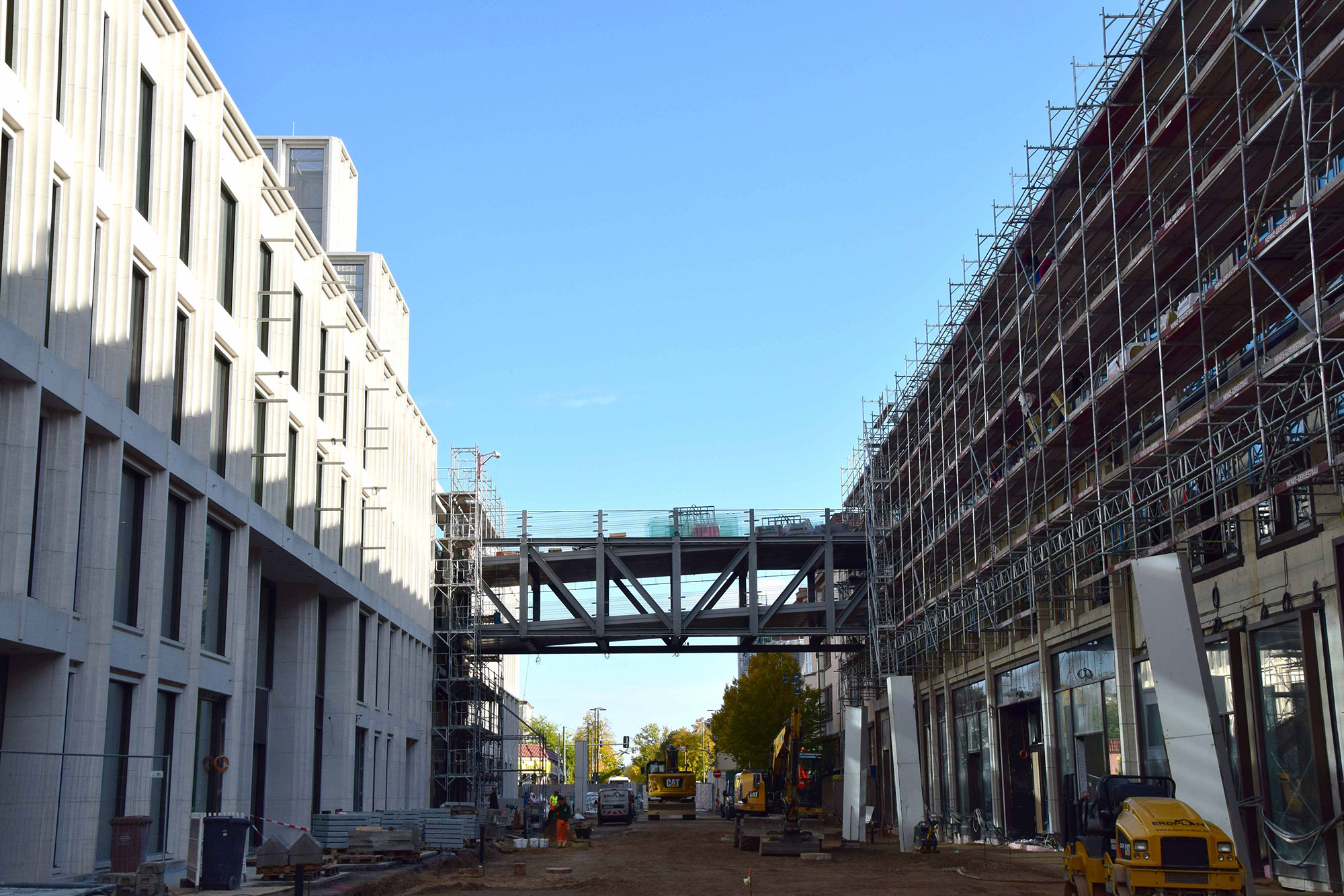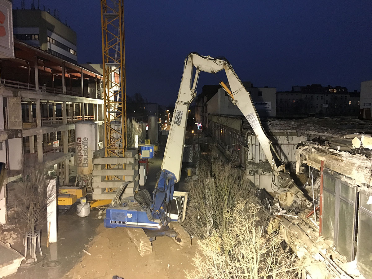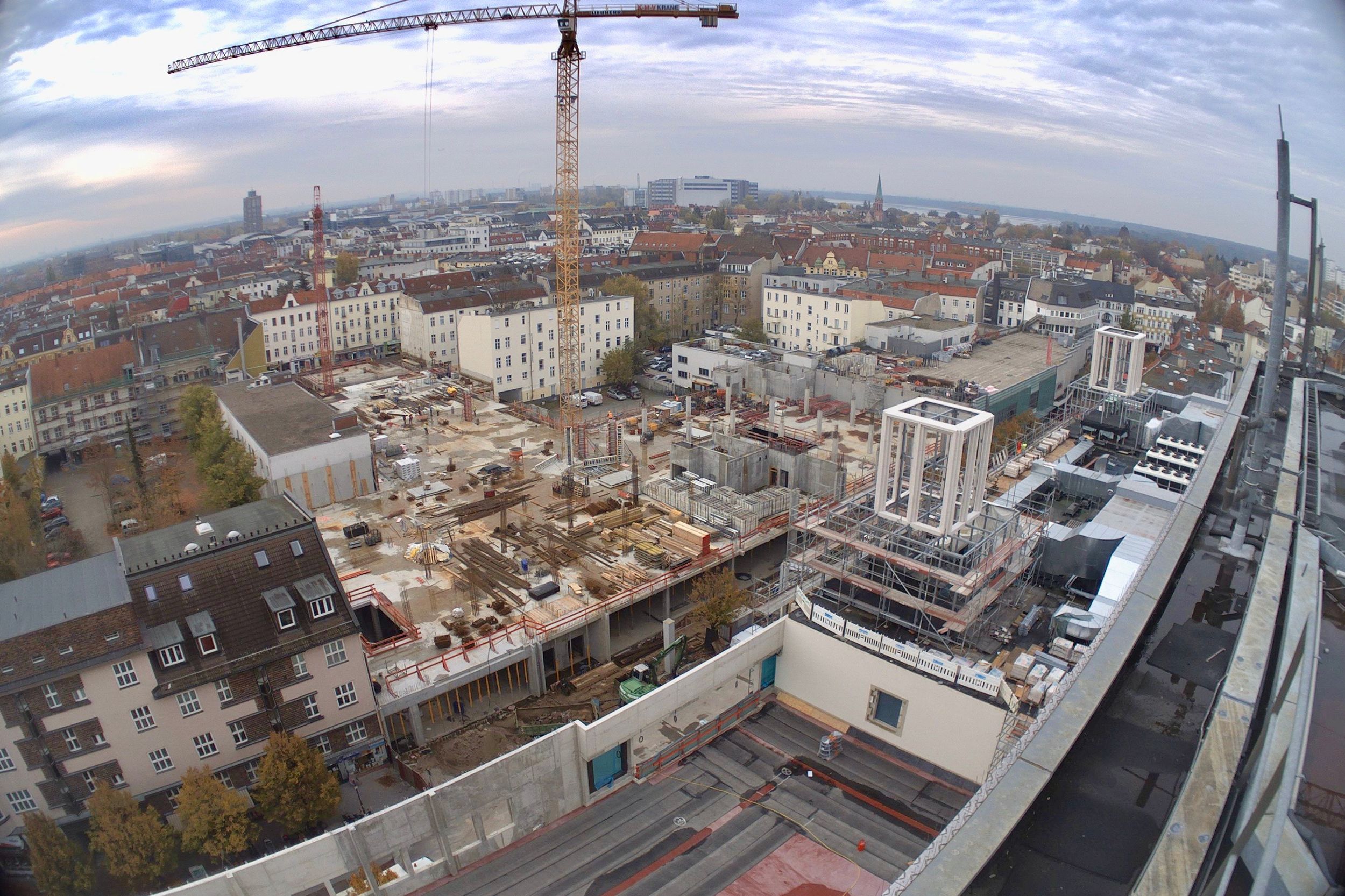 Im Bauteil Süd wurden im November die Rohbauarbeiten aufgenommen. So wurden unter anderem erste Fundamente betoniert und erste Teilleistungen der Außenwände hergestellt. Die Arbeiten an der Baugrube schreiten weiter voran, die Fertigstellung ist für Frühjahr 2019 geplant. Im Bauteil Nord schreitet der Ausbau der Technischen Gebäudeausstattung (Kälte- und Heiztechnik, Lüftung und Elektro) weiter voran, dazu erfolgt auf der Karstadt-Fläche bis Ende des Jahres der Einbau der Fahrtreppen. Der Ausbau der Trockenwände und die Abdichtung der Dachflächen sind ebenfalls gestartet.