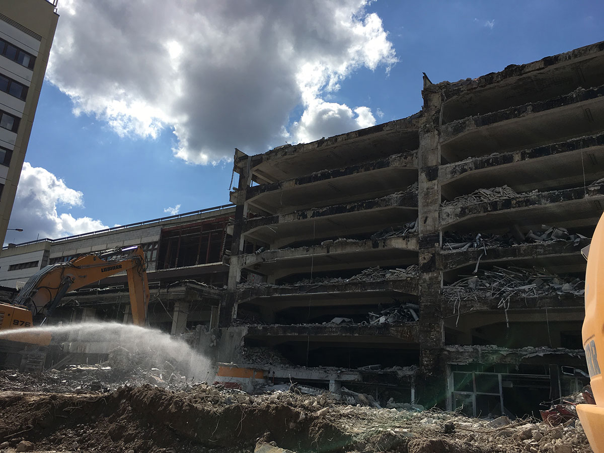 Die Unterkonstruktion für die Natursteinelemente an der Fassade wird montiert. Außerdem wird mit der Aufstockungsmaßnahme im Bereich der Parkdeckebene begonnen. Der erste von vier Bodenplattenabschnitten ist betoniert. Am 8. Juni 2018 legt die HGHI den Grundstein für die neue Fußgängerzone. Weitere Informationen finden Sie in der Pressemitteilung zur Grundsteinlegung.