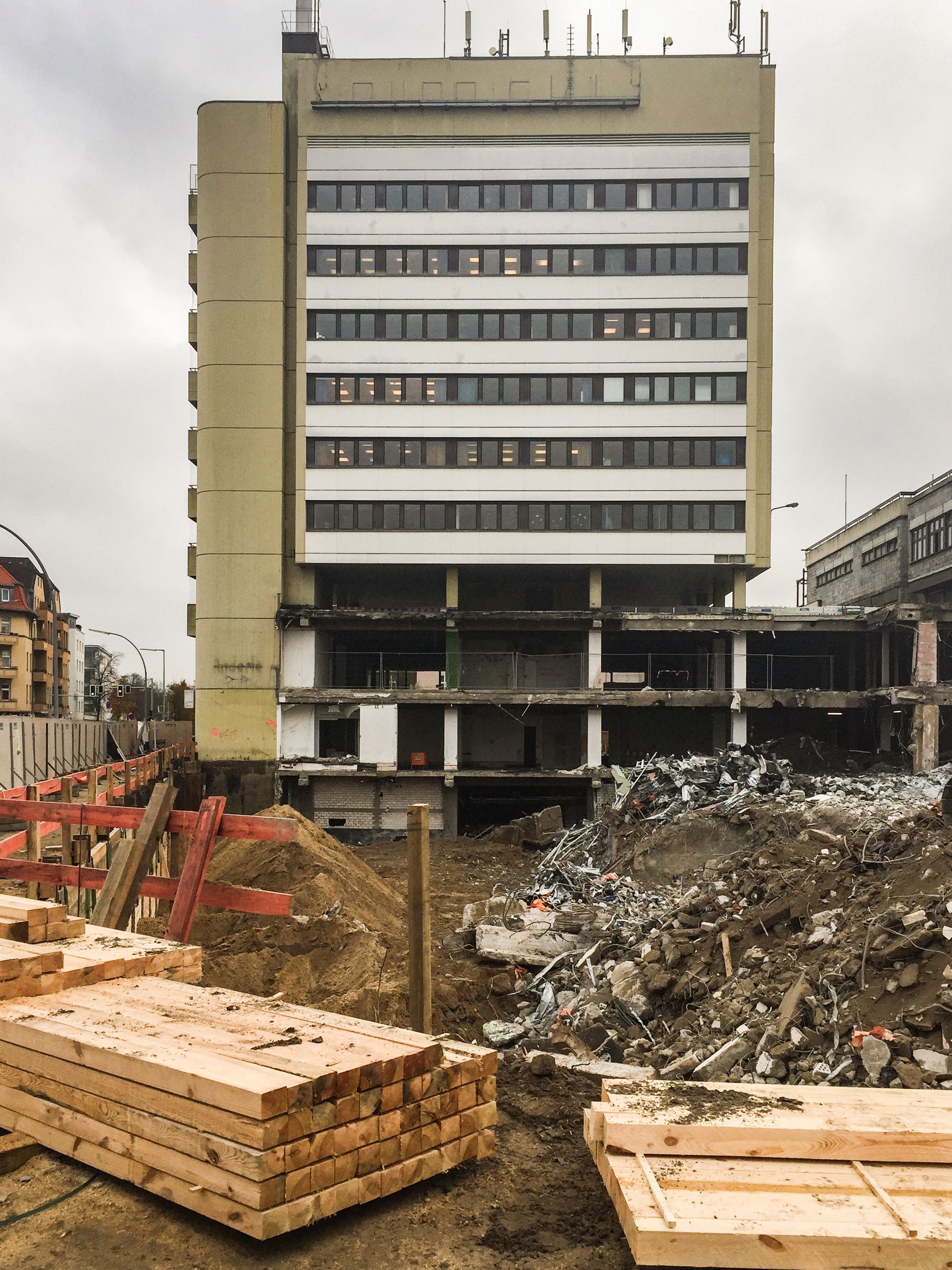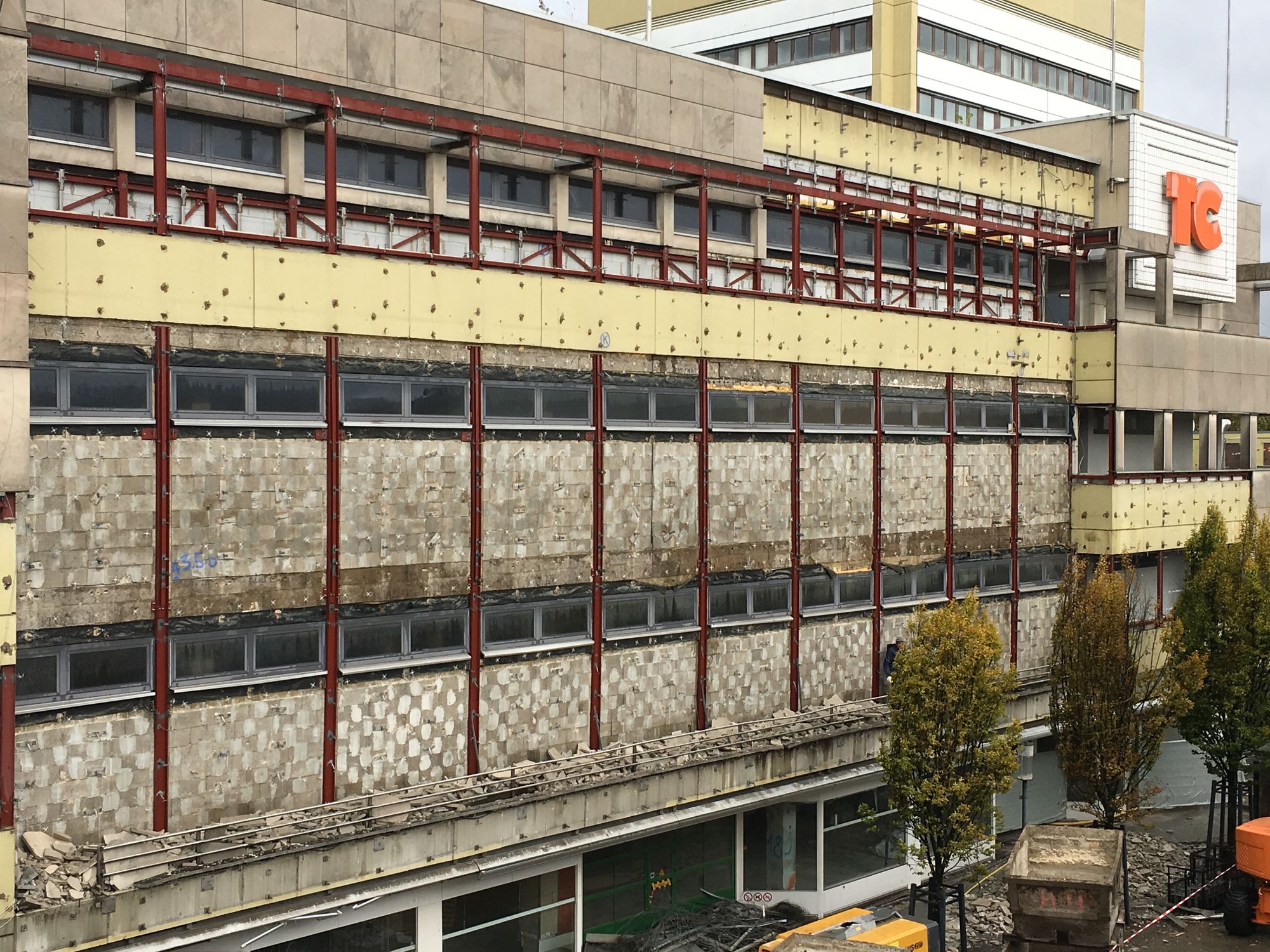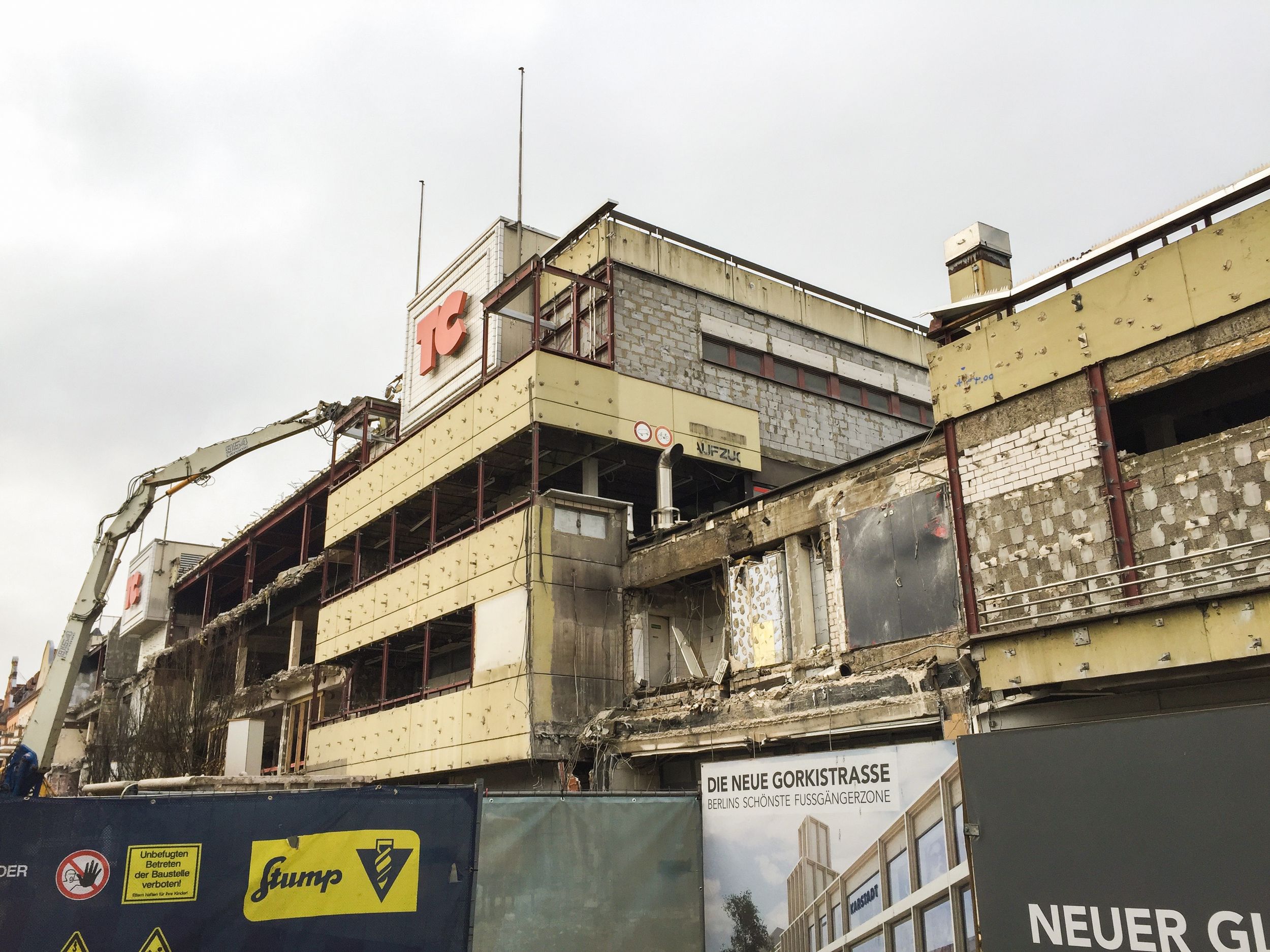 Im Südteil der Fußgängerzone Gorkistraße erfolgt in der Grußdorfstraße bis Ende März 2018 der Abriß des ehemaligen Ärztehauses. Die Bohrpfahlarbeiten für den Südteil werden voraussichtlich Anfang März aufgenommen. Im Nordteil der Fußgängerzone Gorkistraße werden die Treppenhausköpfe zugeschnitten, genau genommen an der Stelle, an denen die alten TC-Buchstaben platziert waren. Im Bereich Neubau Nord wurde die Wasserhaltung eingeschaltet.
