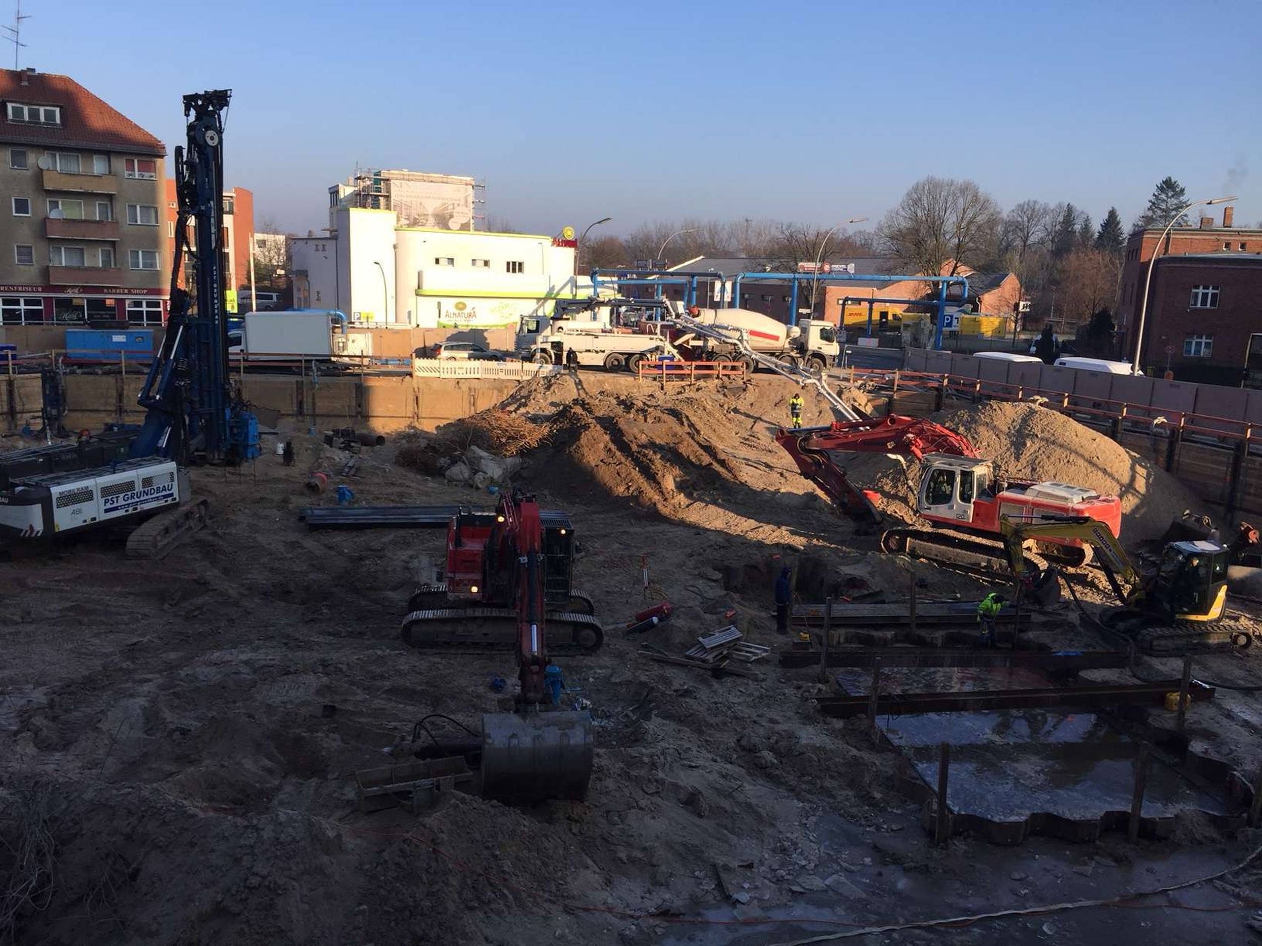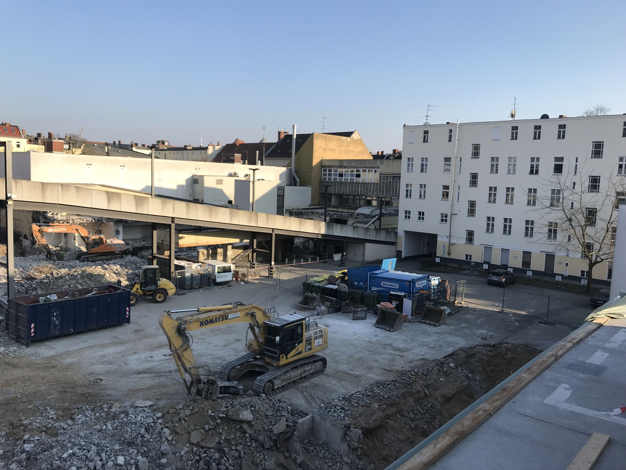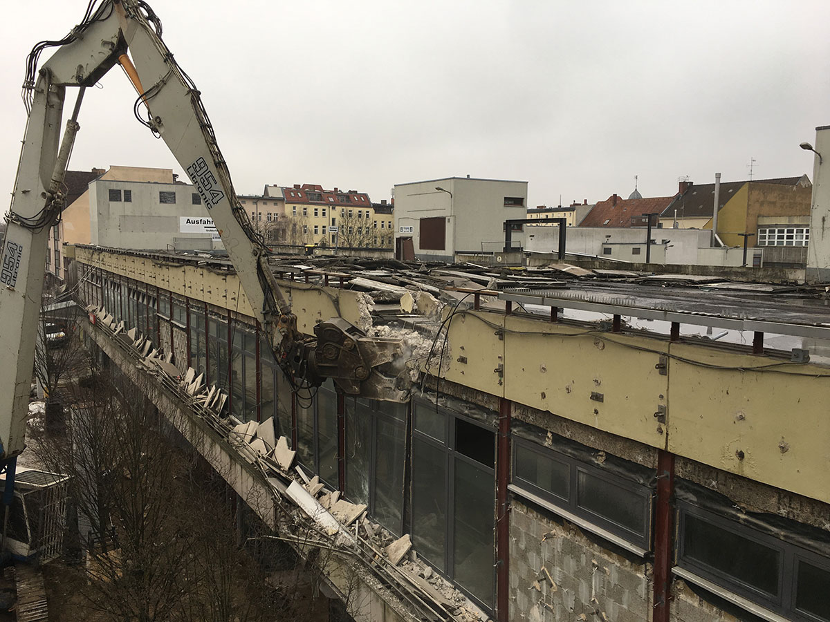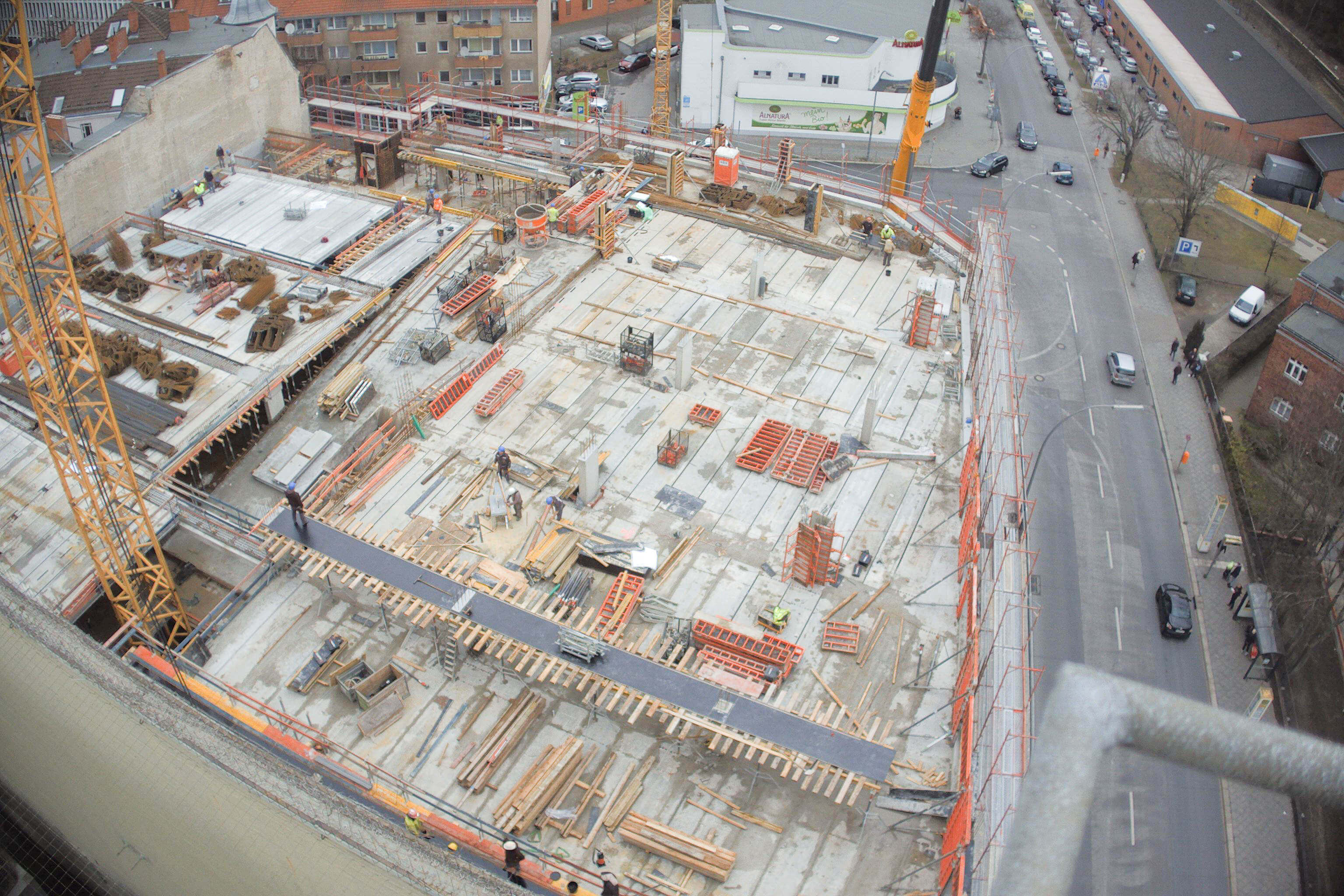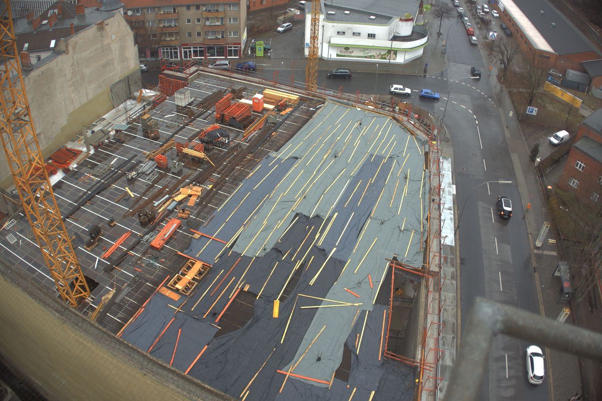 Ein großer Haufen angesammelten Bauschutts wird von der Parkebene im 2.OG. entsorgt. Außerdem wird die Baugrube des Nord-Neubaus ausgeschachtet. Der kalte Berliner Winter macht den Herren vom Bau beides nicht unbedingt einfacher. Die künftige Spielothek darf sich seit Januar außerdem über den Start der Installation der Lüftungsanlage freuen. Weil der Winter hartnäckig und die Installation der Lüftungsanlage eine aufwendige Angelegenheit ist, bekommt die Spielothek außerdem einen provisorischen Regenschutz.
