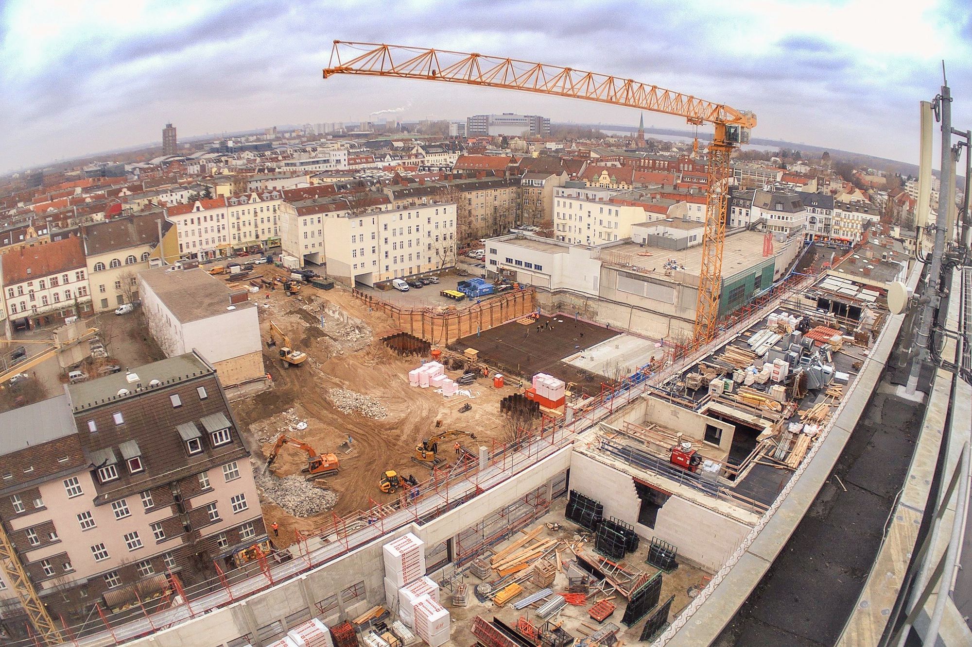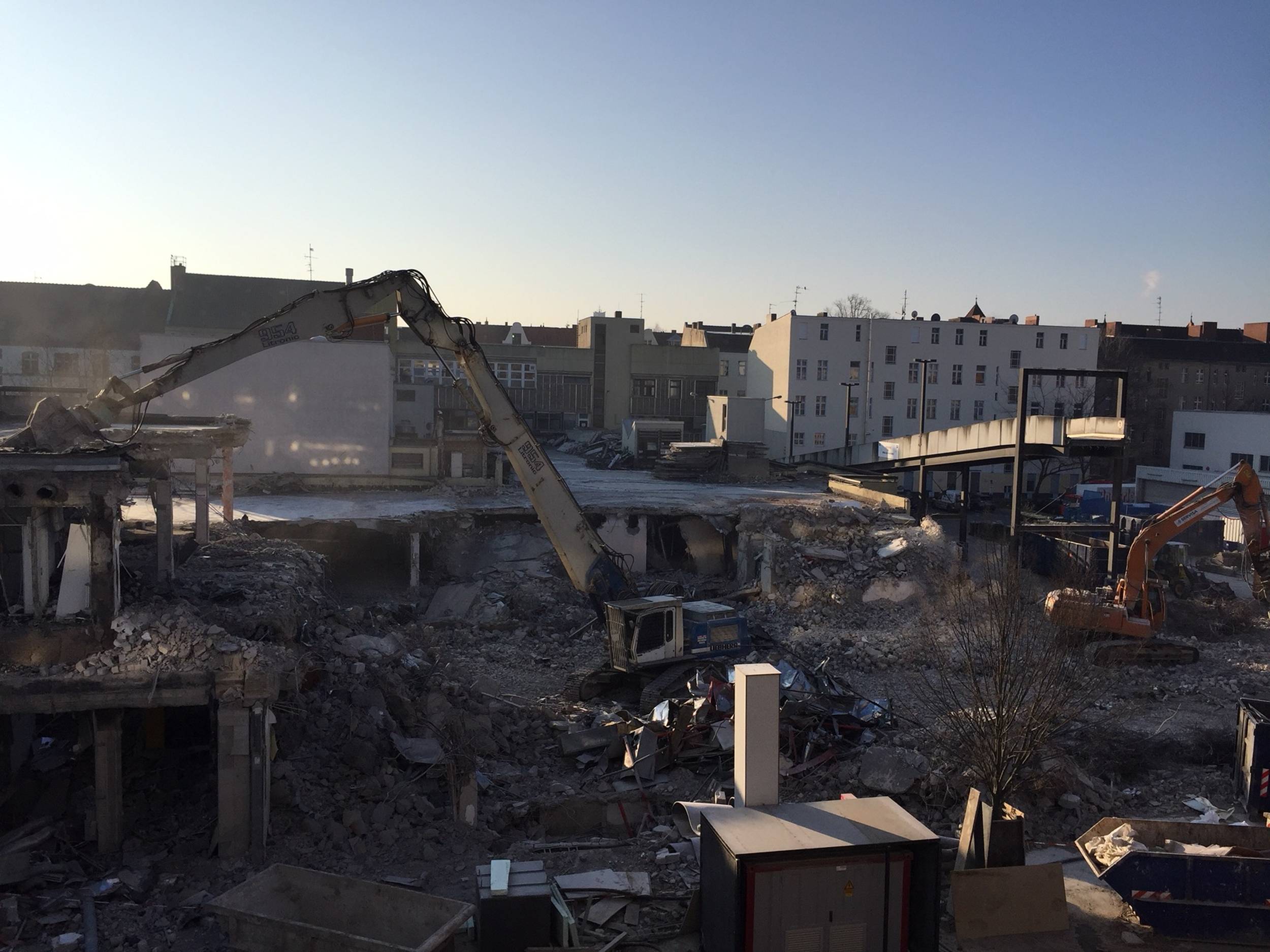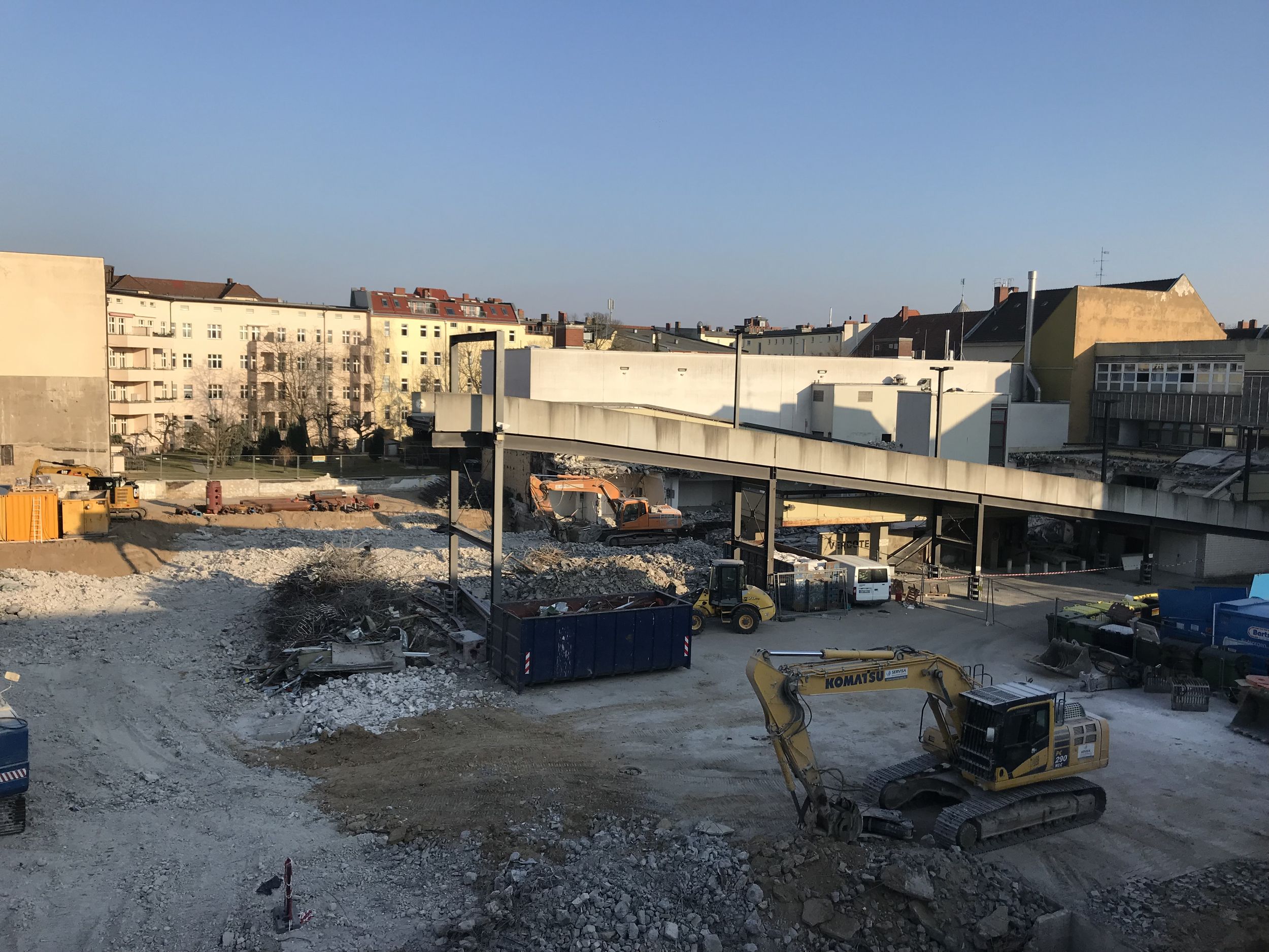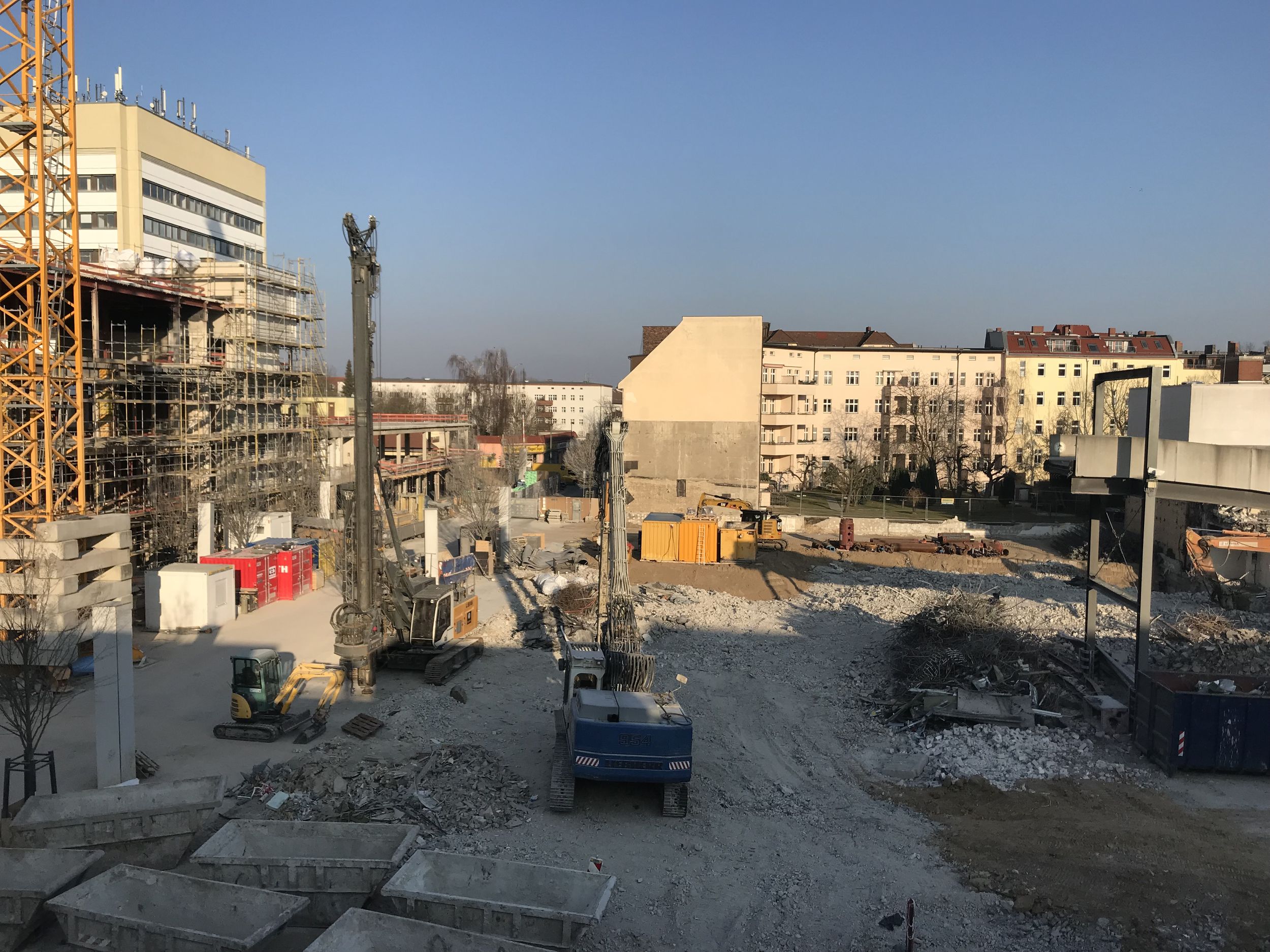 Ein großer Haufen angesammelten Bauschutts wird von der Parkebene im 2.OG. entsorgt. Außerdem wird die Baugrube des Nord-Neubaus ausgeschachtet. Der kalte Berliner Winter macht den Herren vom Bau beides nicht unbedingt einfacher. Die künftige Spielothek darf sich seit Januar außerdem über den Start der Installation der Lüftungsanlage freuen. Weil der Winter hartnäckig und die Installation der Lüftungsanlage eine aufwendige Angelegenheit ist, bekommt die Spielothek außerdem einen provisorischen Regenschutz.