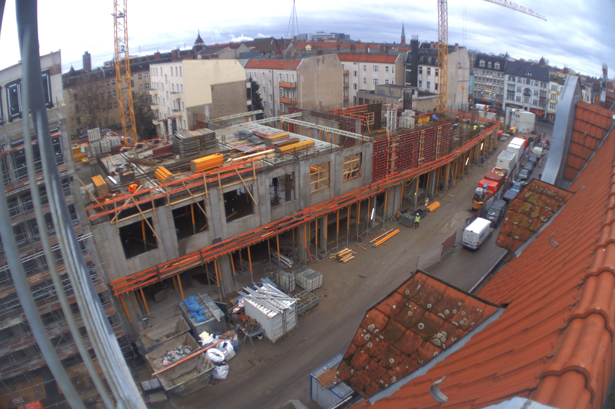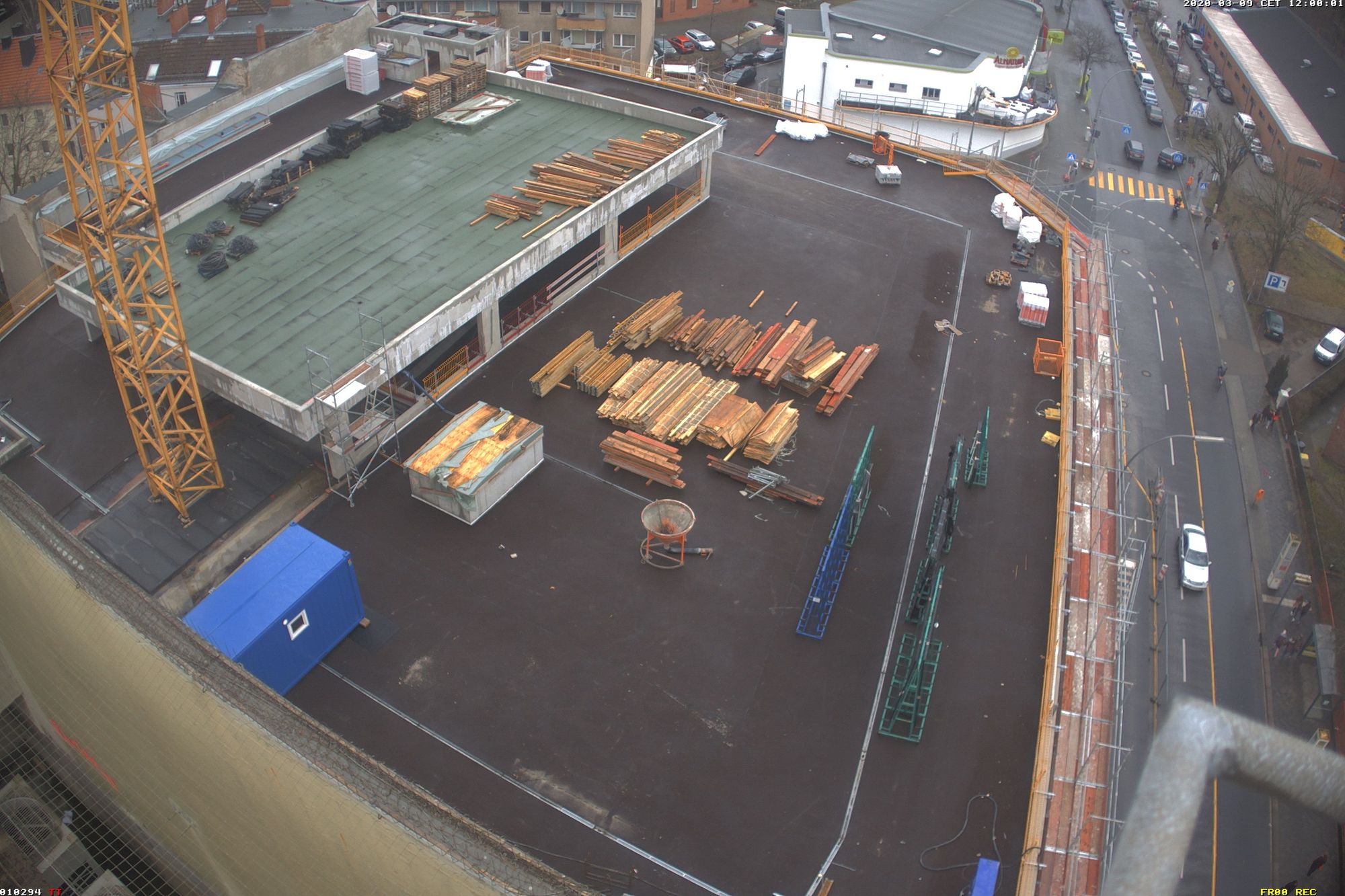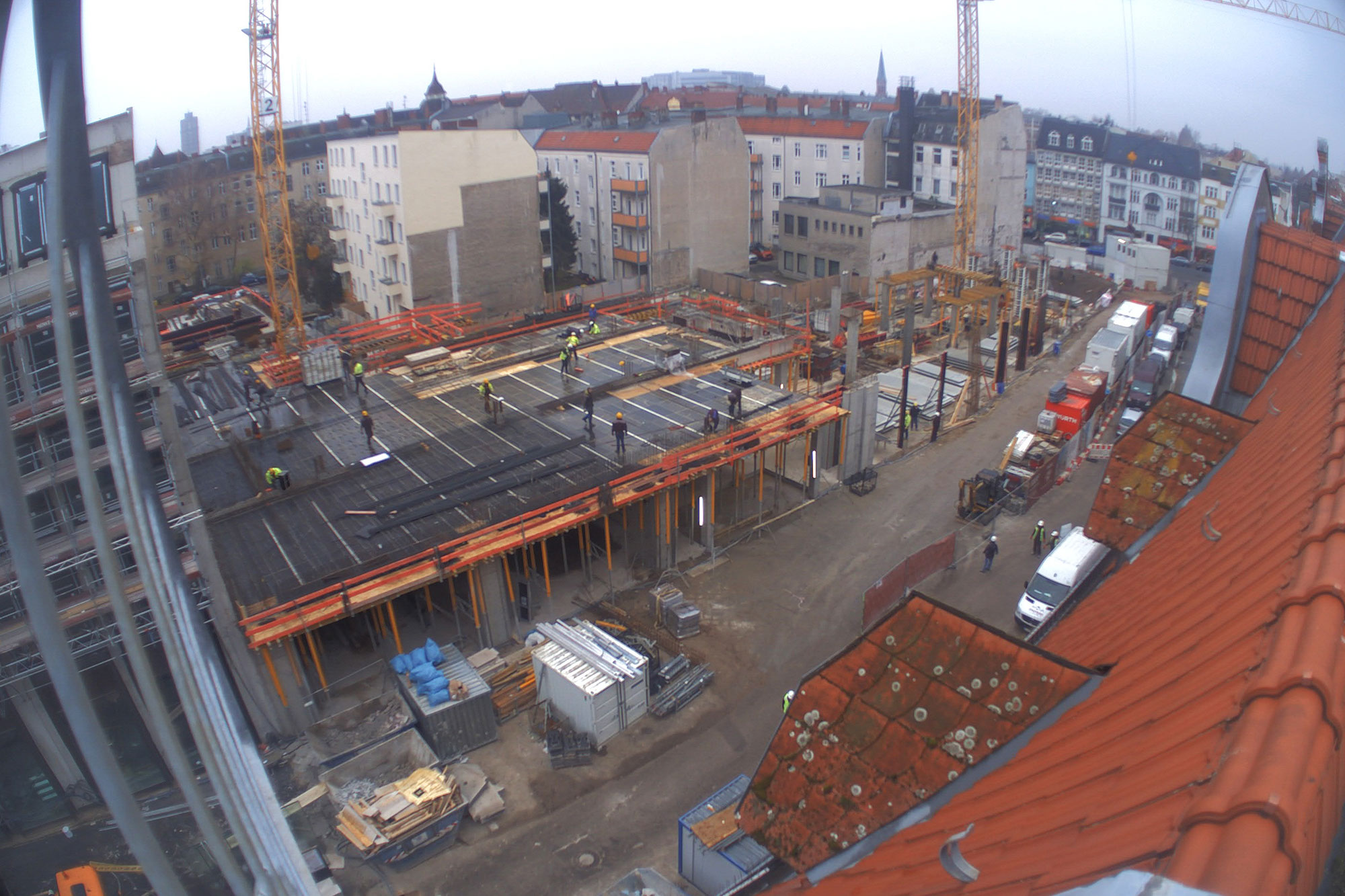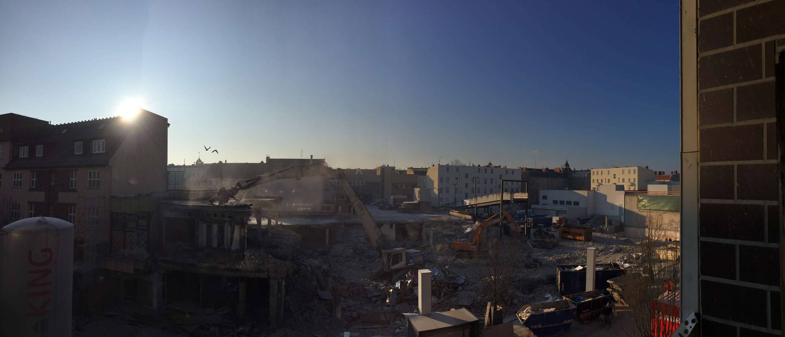 Ein großer Haufen angesammelten Bauschutts wird von der Parkebene im 2.OG. entsorgt. Außerdem wird die Baugrube des Nord-Neubaus ausgeschachtet. Der kalte Berliner Winter macht den Herren vom Bau beides nicht unbedingt einfacher. Die künftige Spielothek darf sich seit Januar außerdem über den Start der Installation der Lüftungsanlage freuen. Weil der Winter hartnäckig und die Installation der Lüftungsanlage eine aufwendige Angelegenheit ist, bekommt die Spielothek außerdem einen provisorischen Regenschutz.