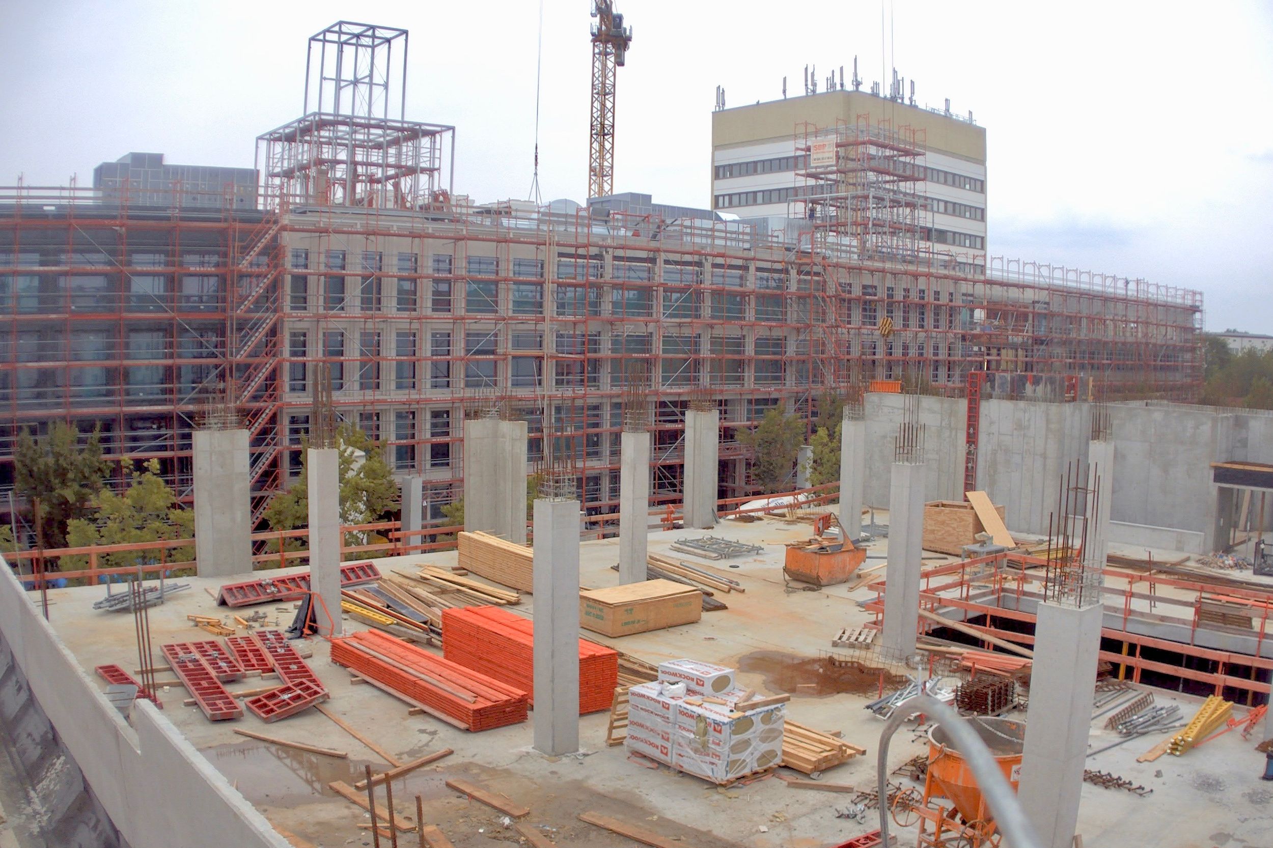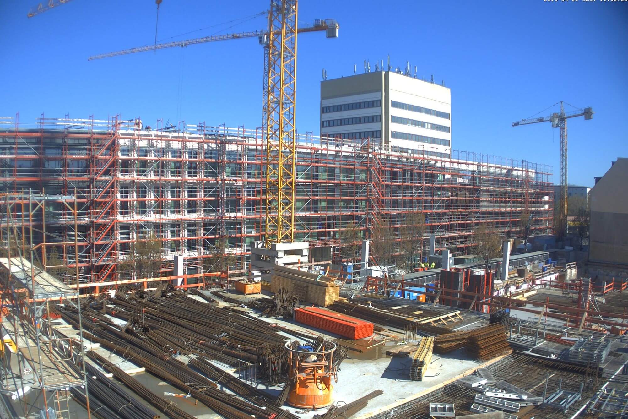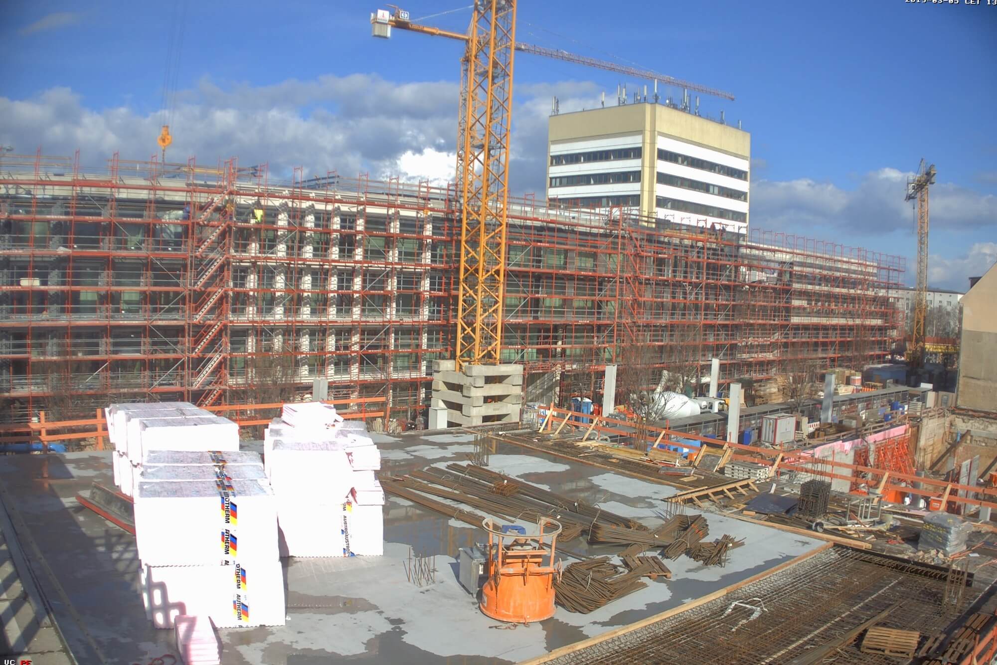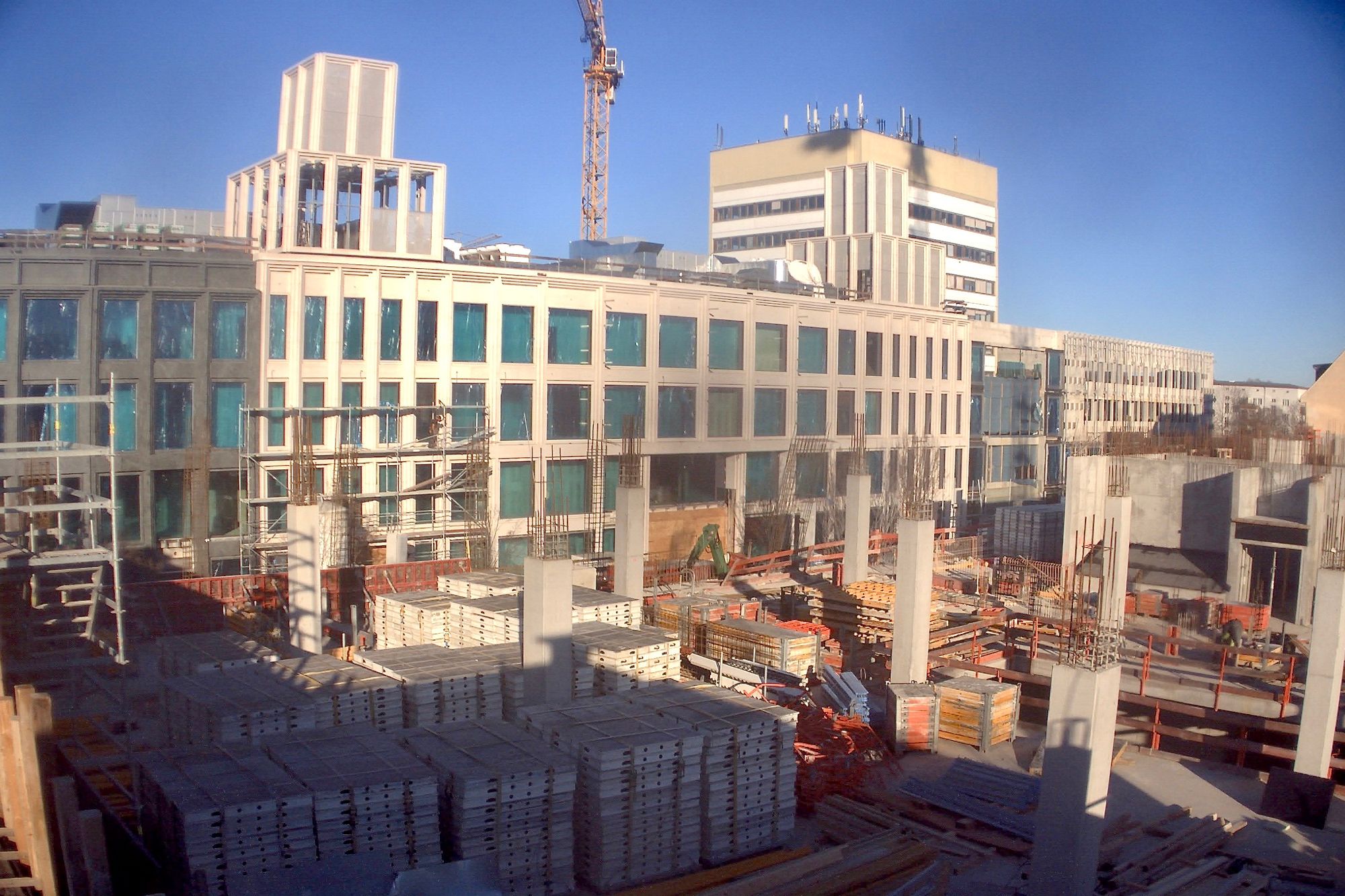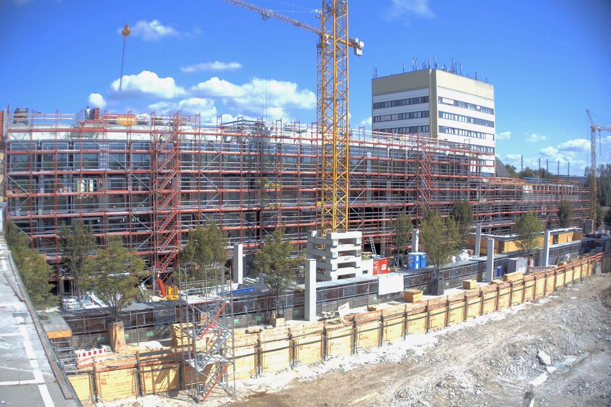 Im Bauteil Nord wird weiter am Ausbau des Innenbereichs und an der Außenfassade gearbeitet (Einbau Fenster, Abdichtung der Decken etc.)
