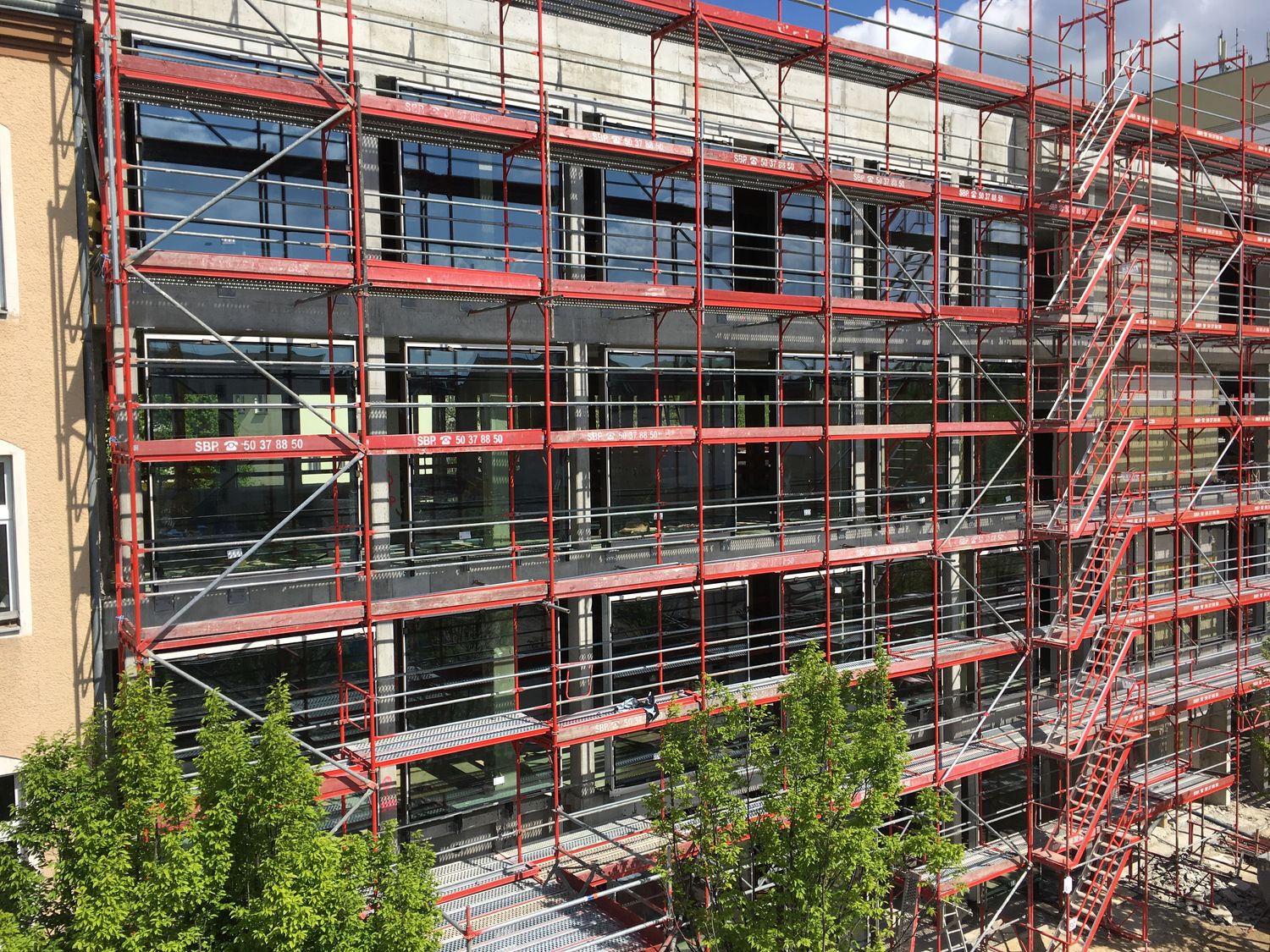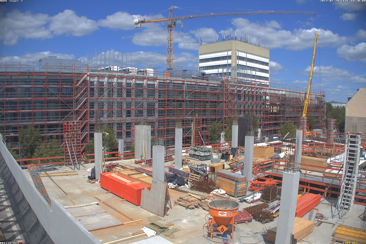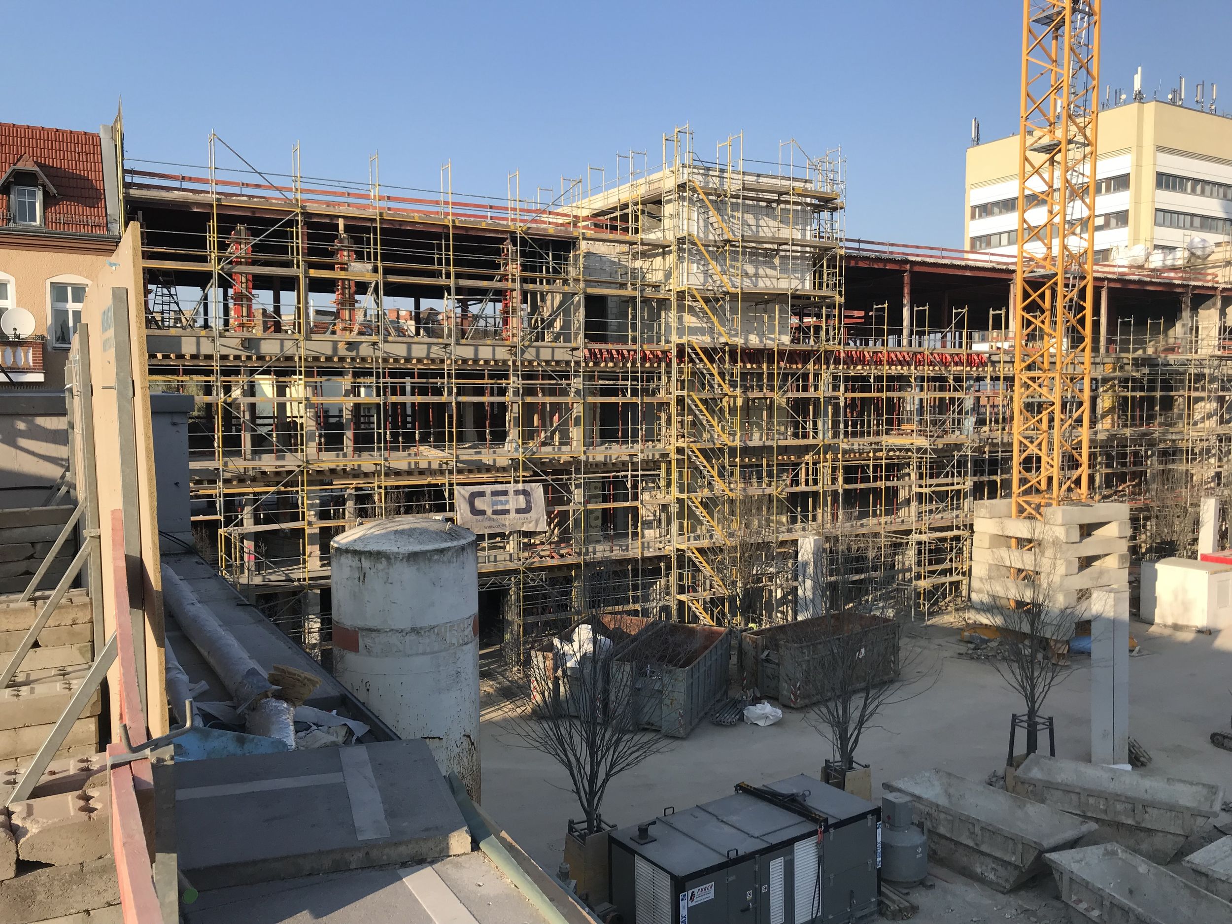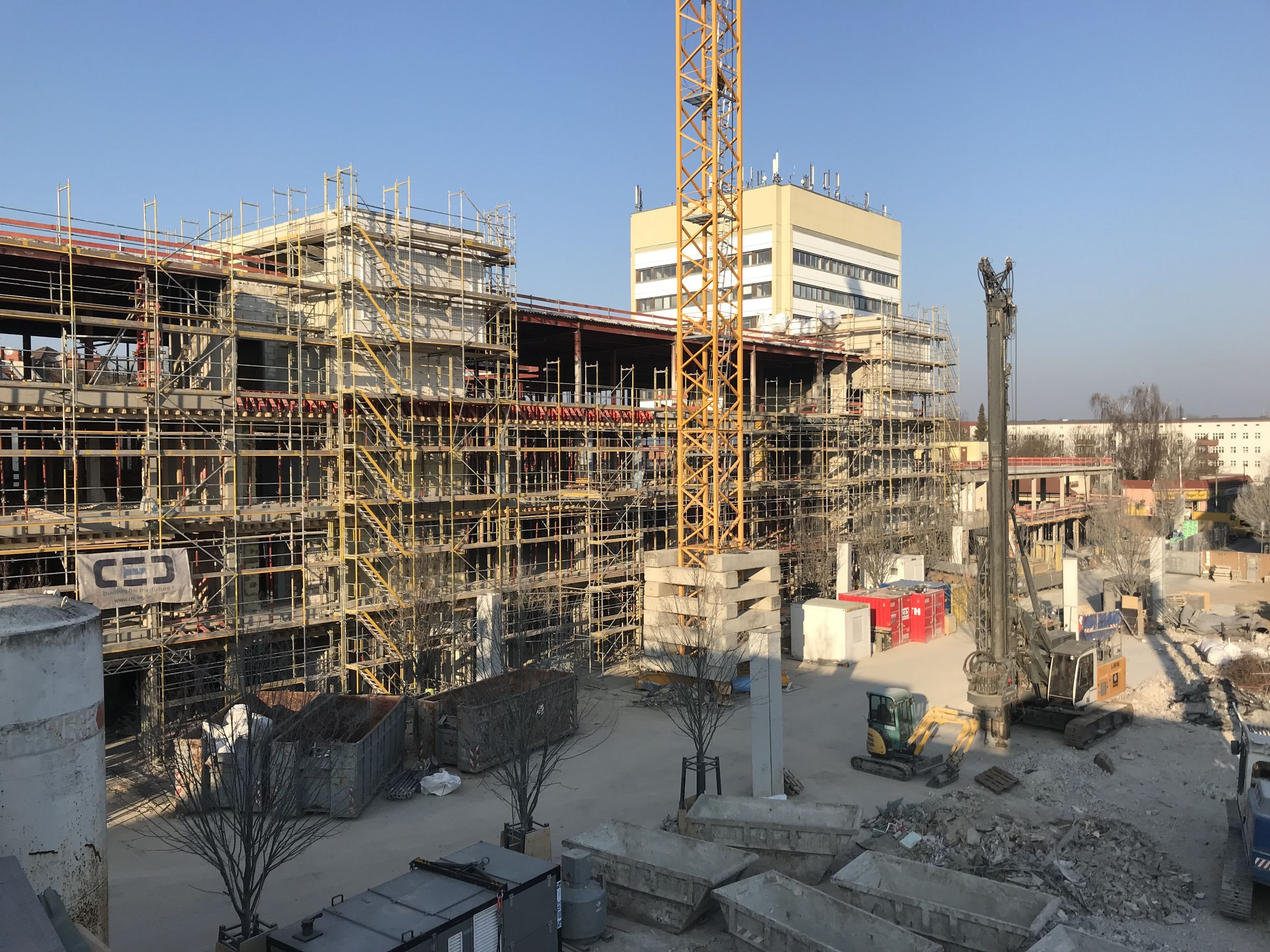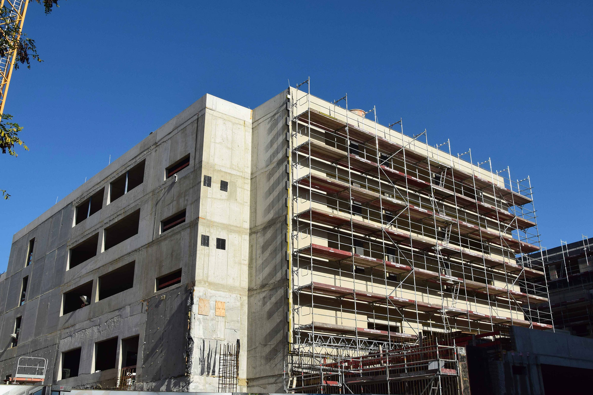 Im Bauteil Nord wird weiter am Ausbau des Innenbereichs und an der Außenfassade gearbeitet (Einbau Fenster, Abdichtung der Decken etc.)