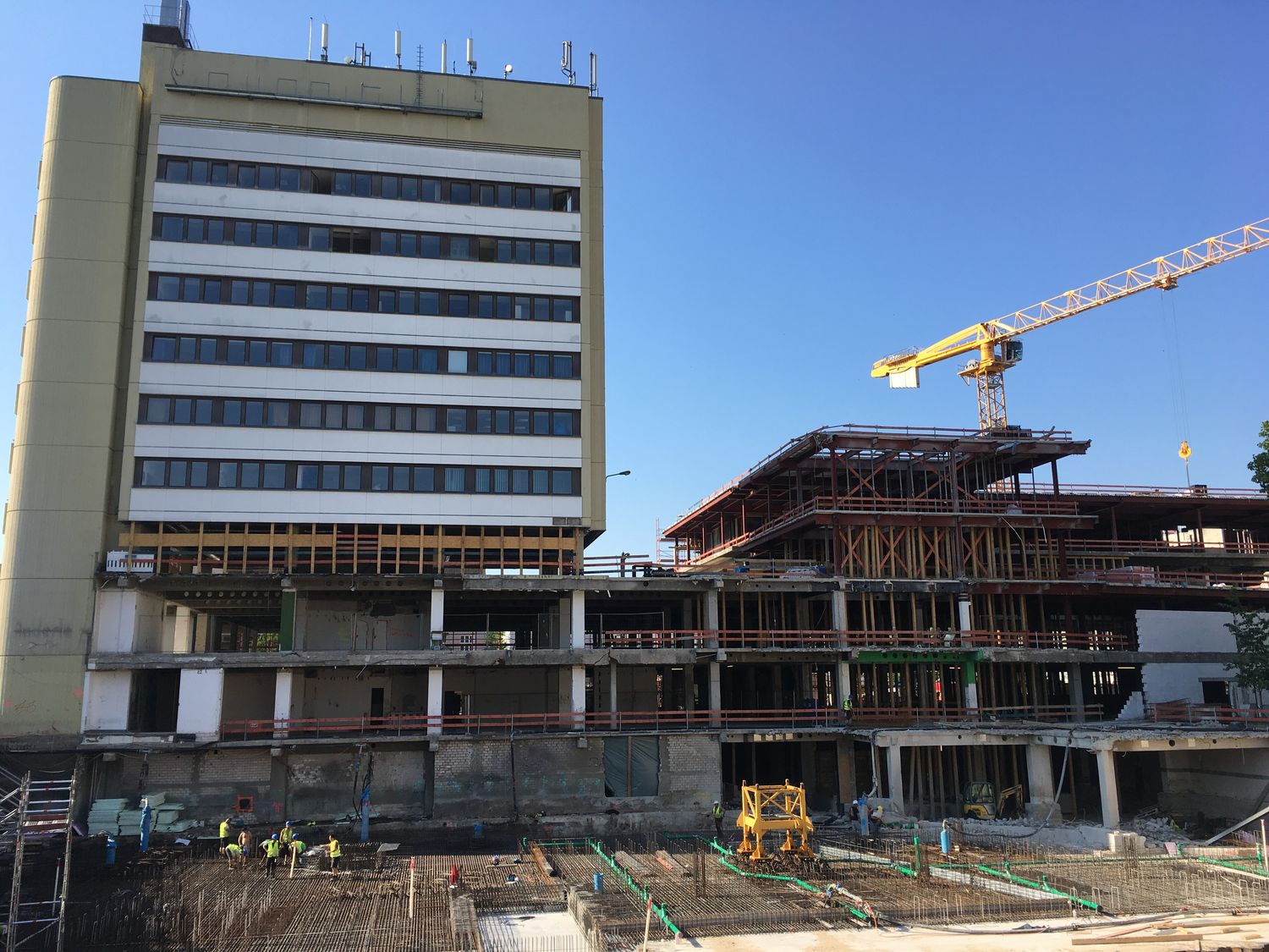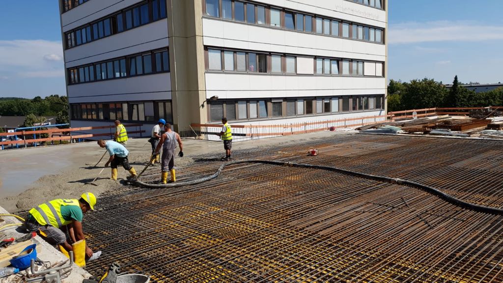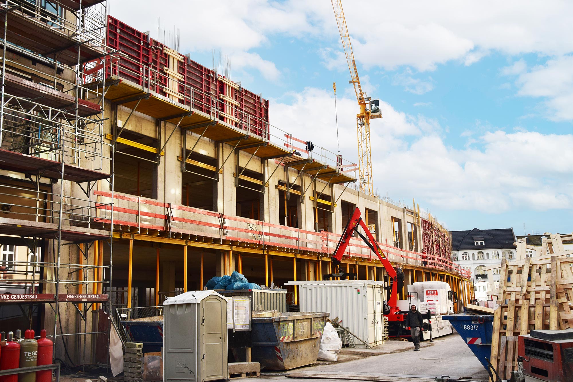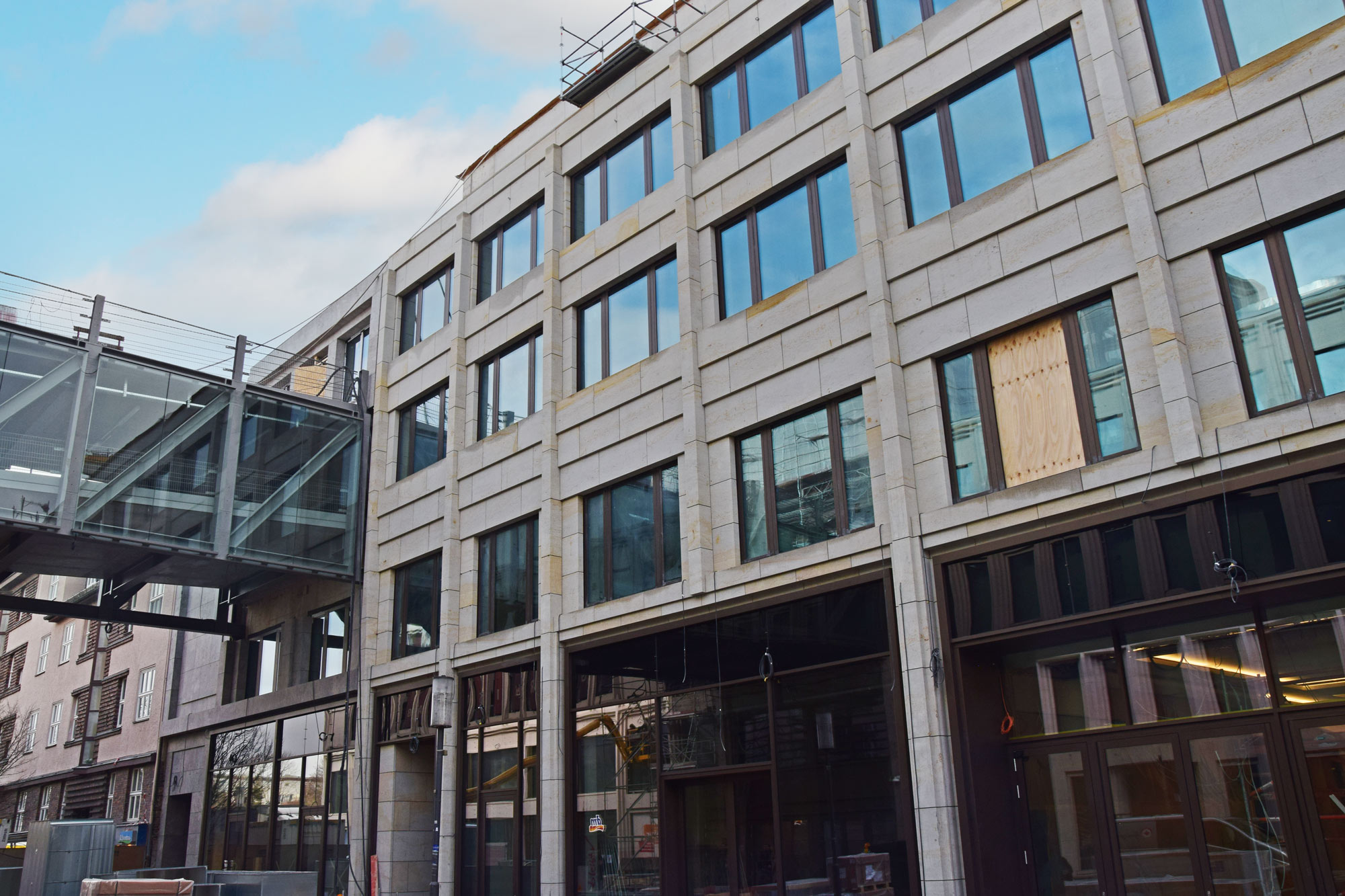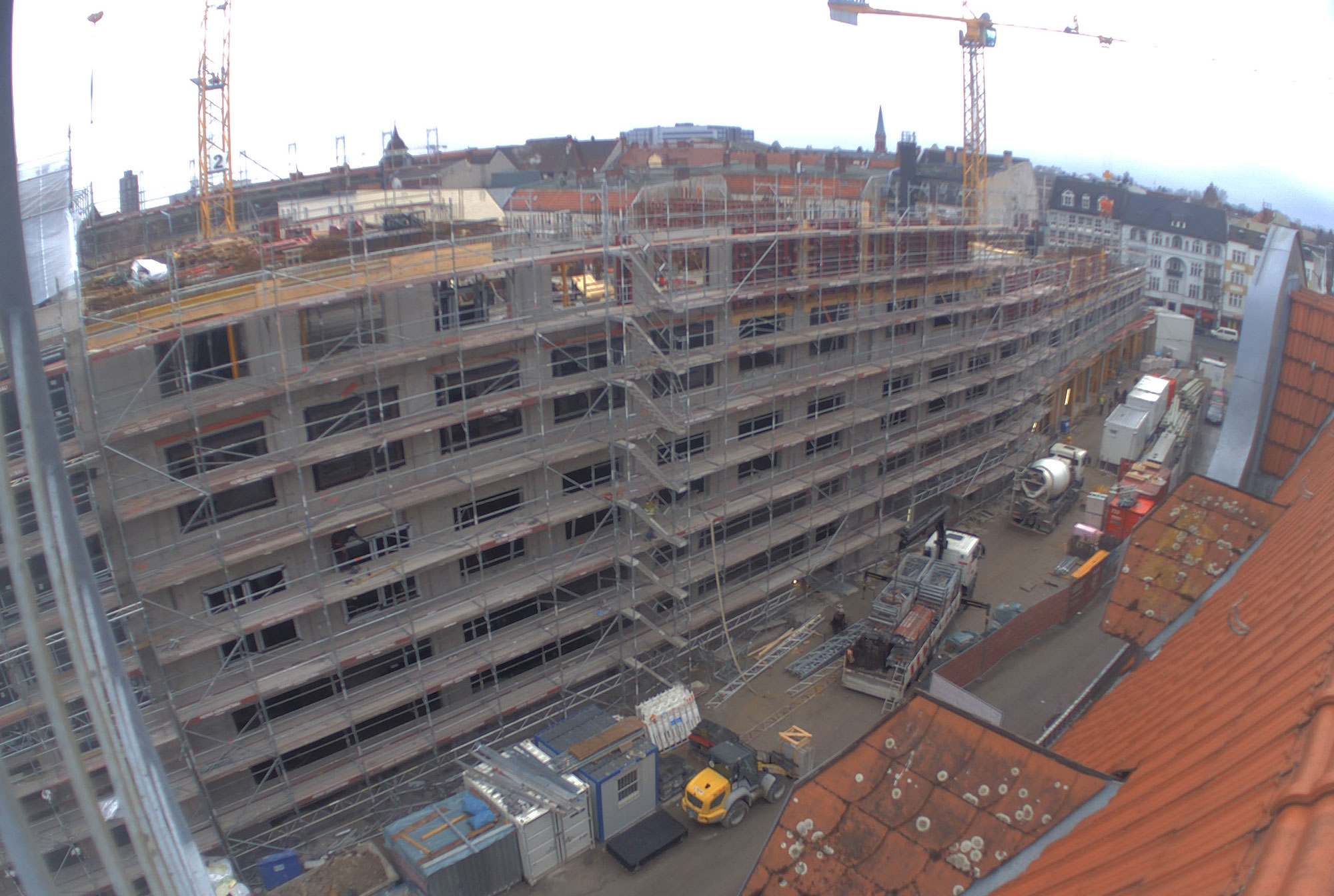 Im Bauteil Nord wird weiter am Ausbau des Innenbereichs und an der Außenfassade gearbeitet (Einbau Fenster, Abdichtung der Decken etc.)