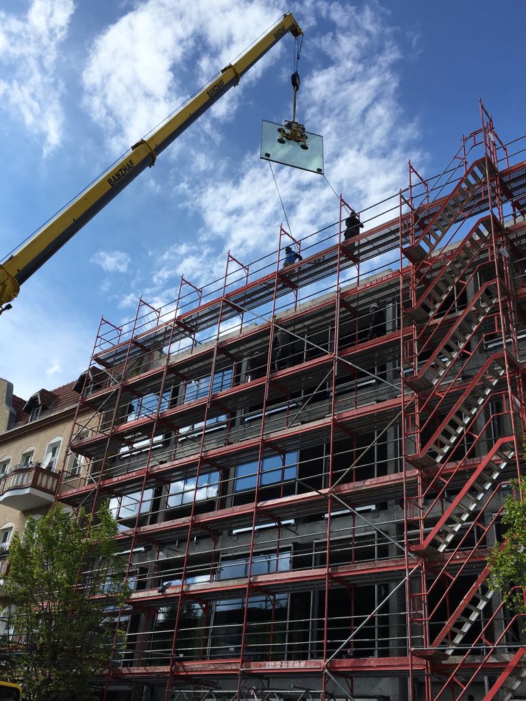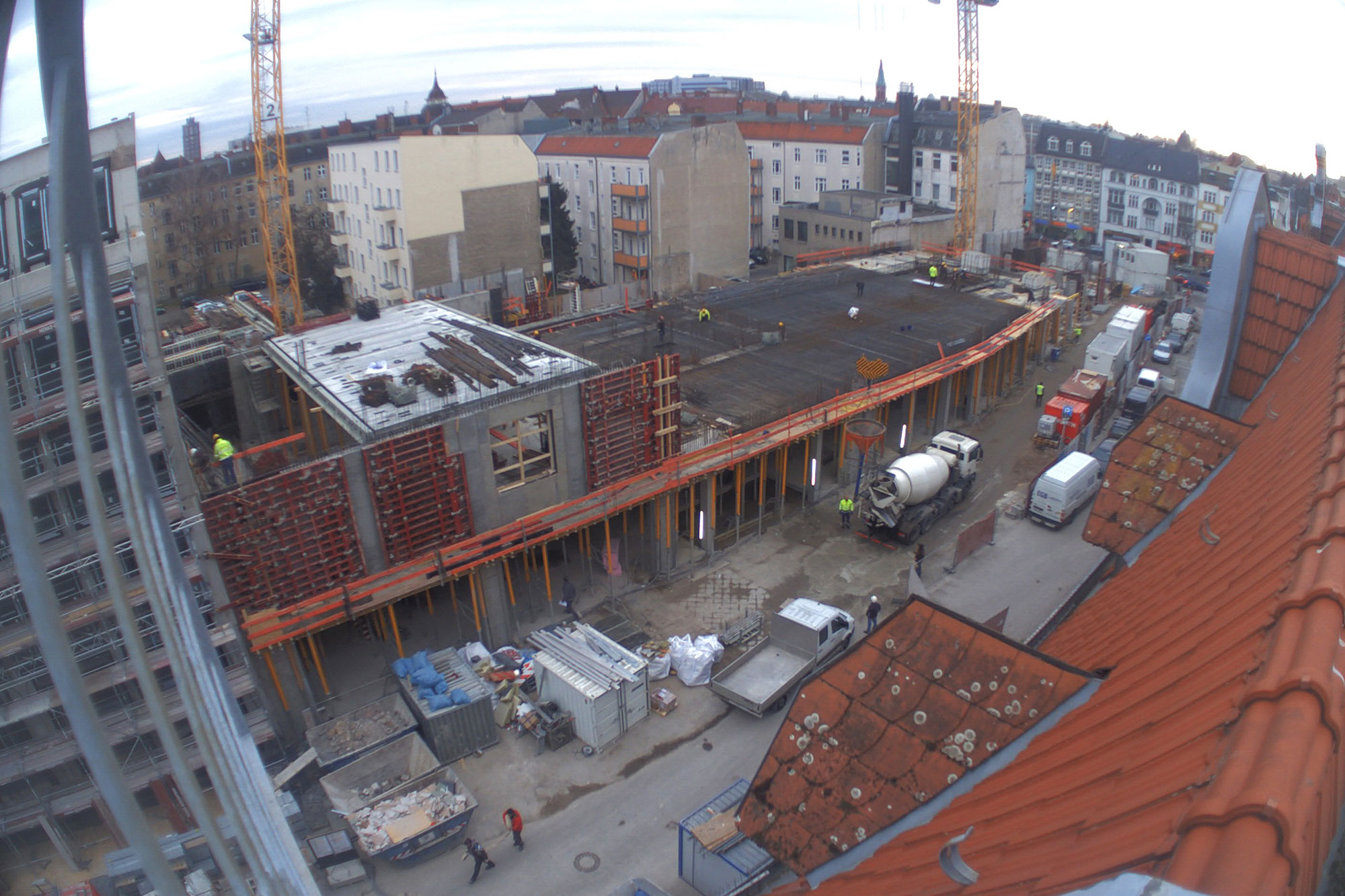 Im Februar wird entkernt, entschalt und ausgeschachtet, was die Kräfte der Bauarbeiter hergeben. Damit die Männer ihre Baumaterialien mit dem Kran gut in die offene Baustelle transportieren können, wird zeitweise ein Teil des Daches geöffnet. Langsam nimmt die Fassade an der Gorkistraße Gestalt an.