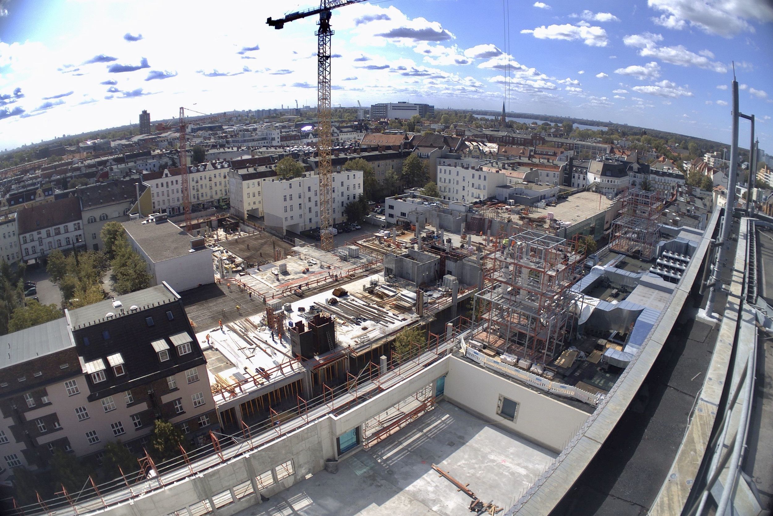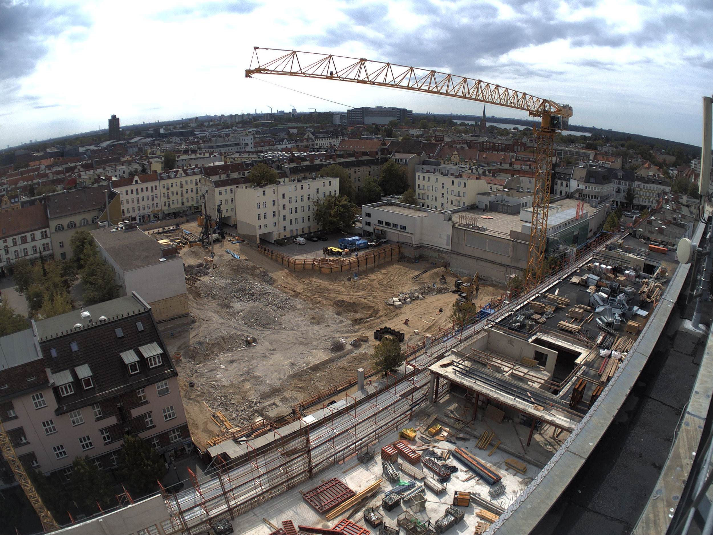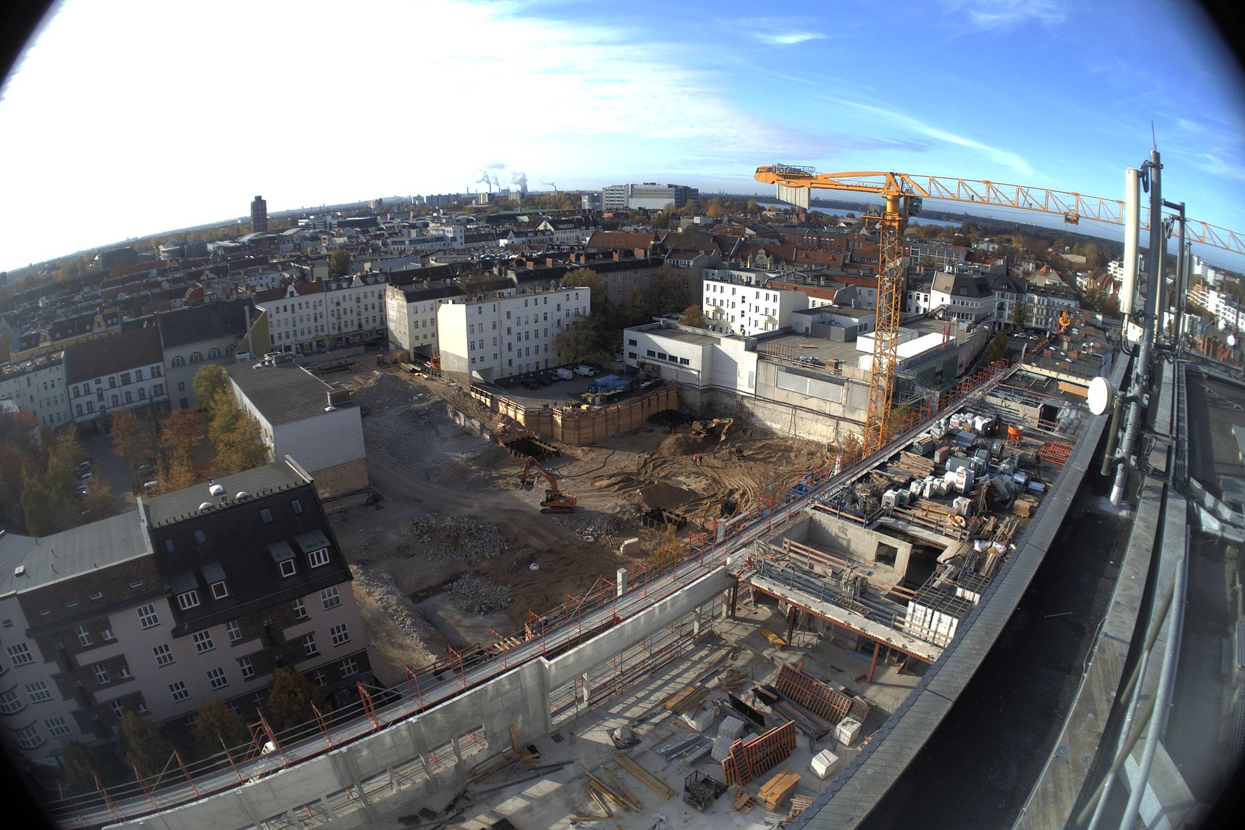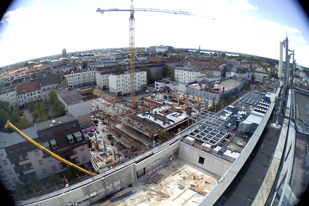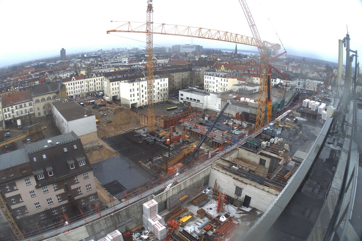 Im Bauteil Süd erfolgte eine Grundwasserabsenkung, um die Tiefbauarbeiten aufnehmen zu können. Im Bauteil Nord schreitet die Fassadengestaltung der Karstadt-Fläche an der Gorkistraße weiter voran. Nach Fertigstellung der sogenannten Pfosten-Riegel-Fassade wurden die Natursteinarbeiten aufgenommen. Darüber hinaus ist die Aufstockung von der ersten Etage bis dritten Obergeschoss finalisiert worden