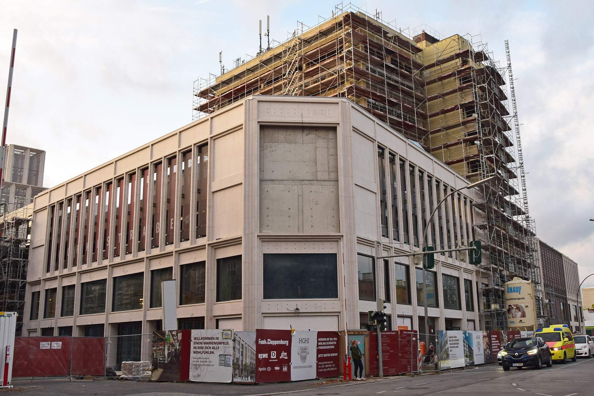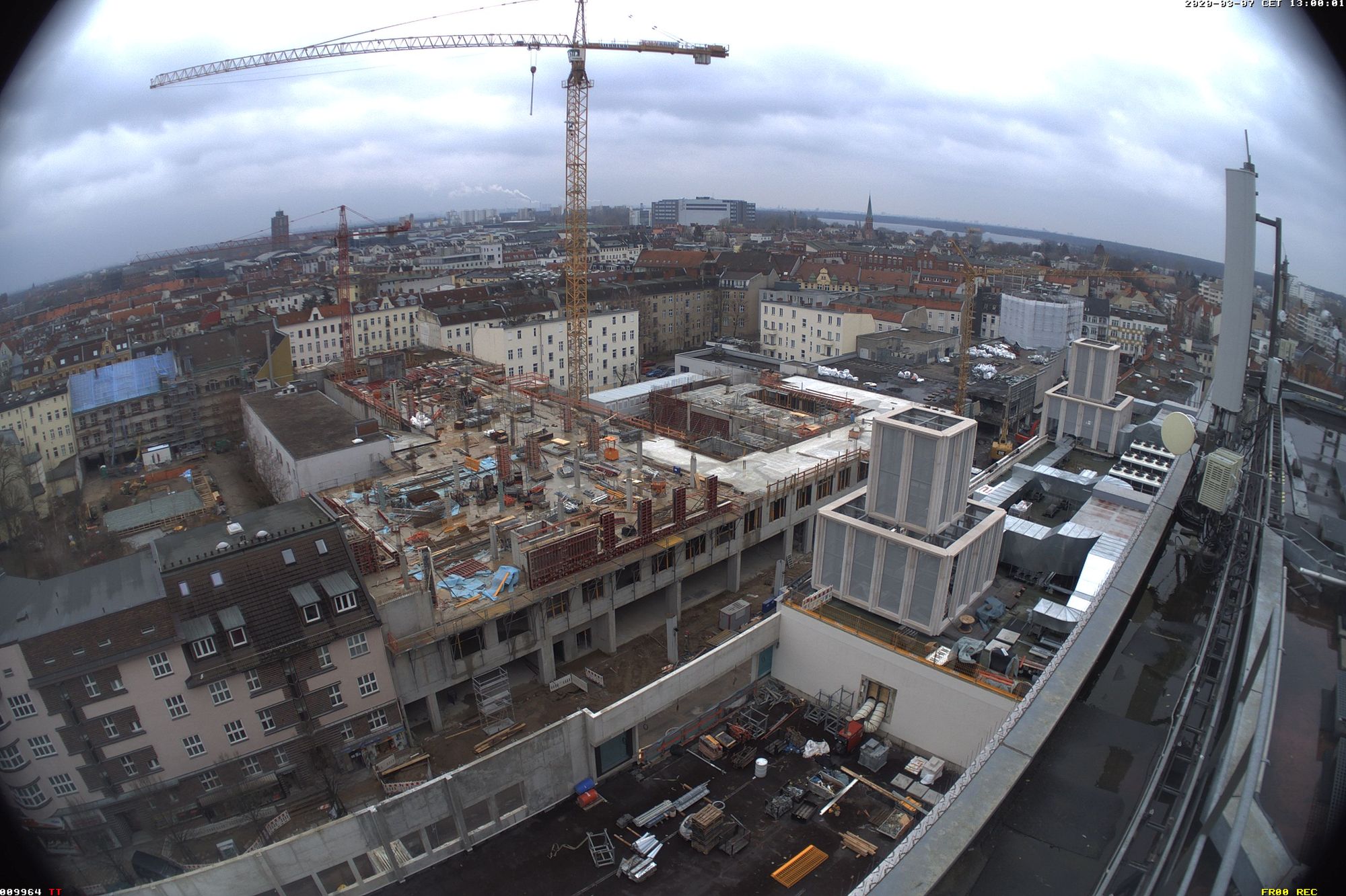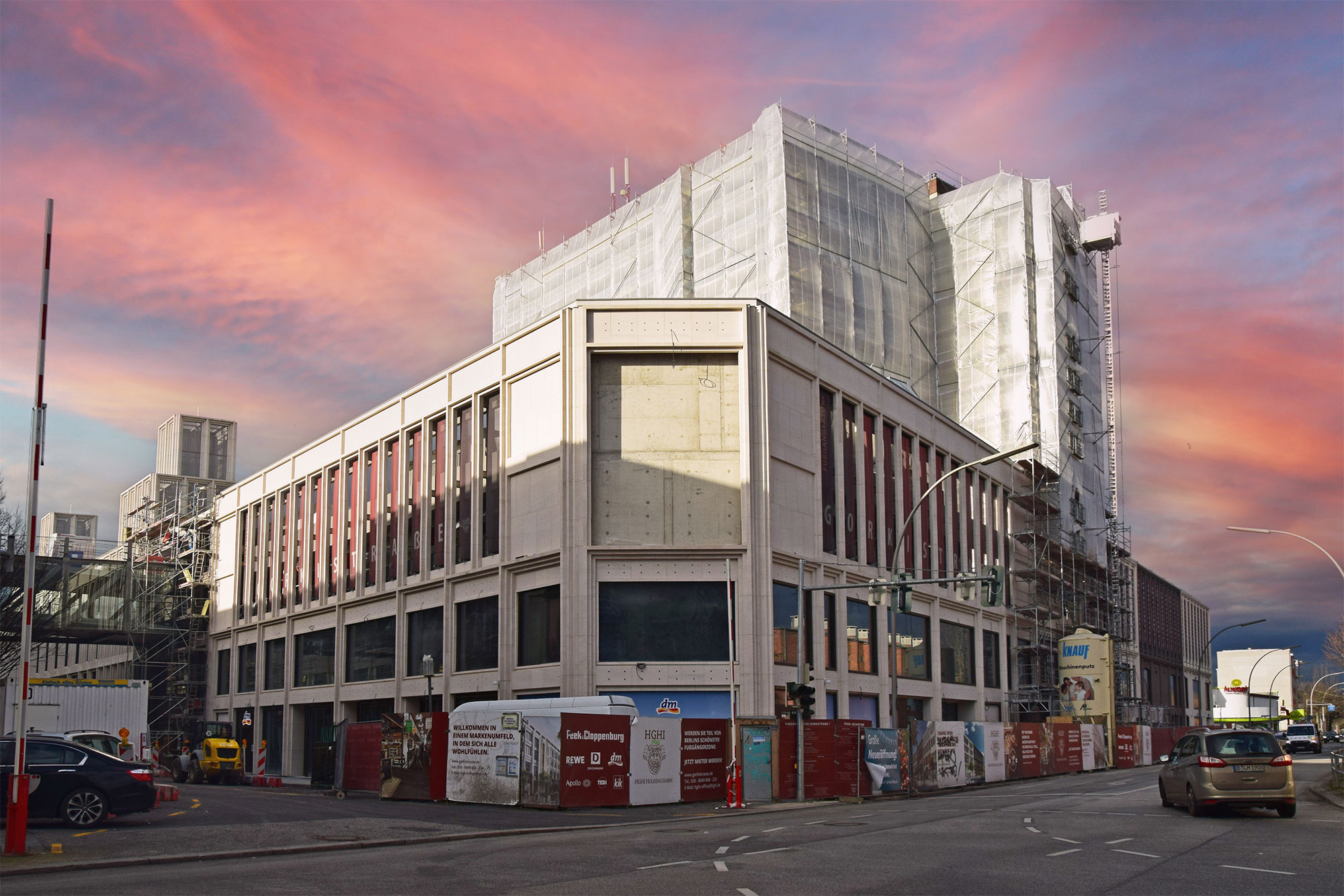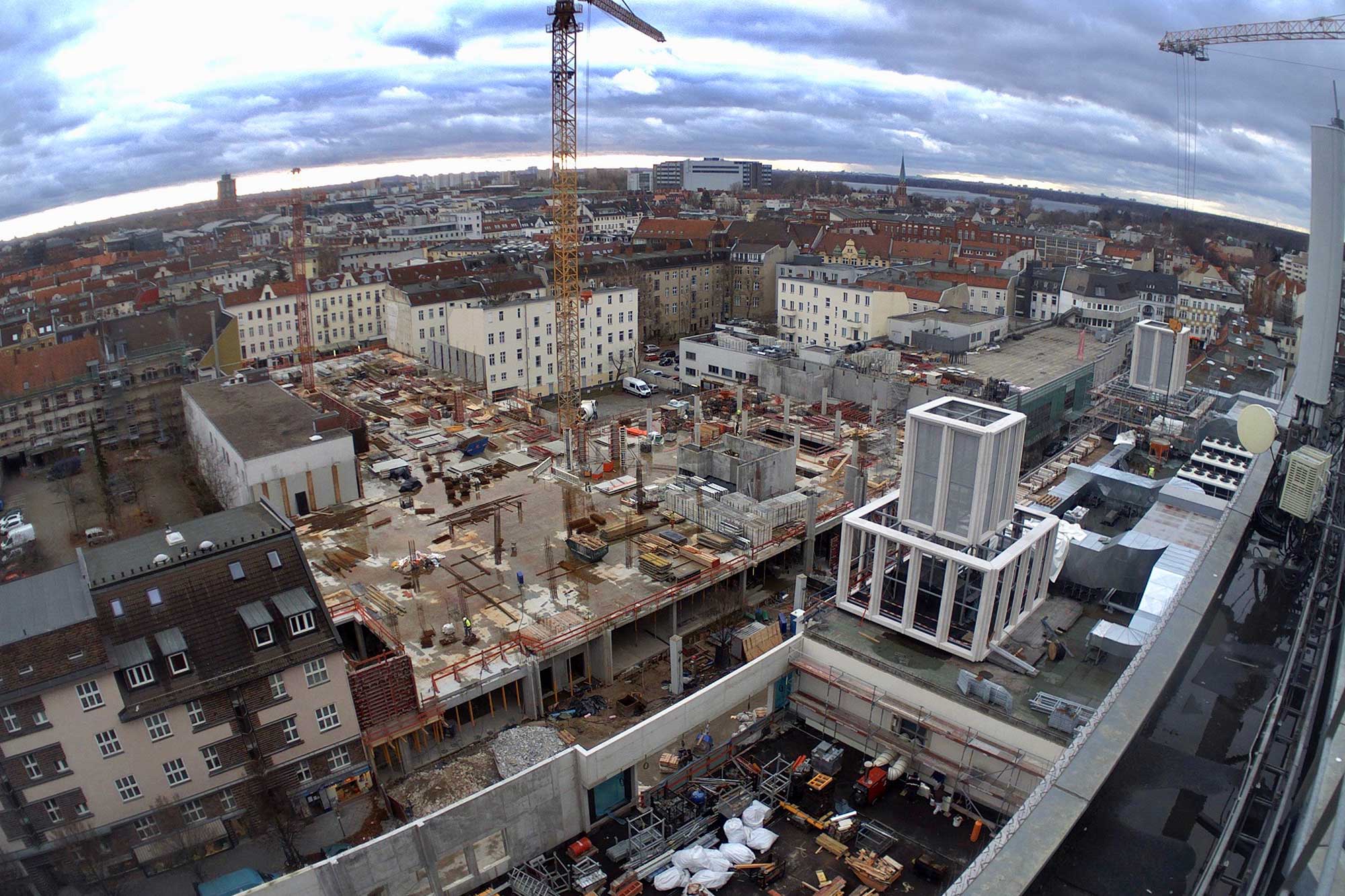 Im Bauteil Süd erfolgte eine Grundwasserabsenkung, um die Tiefbauarbeiten aufnehmen zu können. Im Bauteil Nord schreitet die Fassadengestaltung der Karstadt-Fläche an der Gorkistraße weiter voran. Nach Fertigstellung der sogenannten Pfosten-Riegel-Fassade wurden die Natursteinarbeiten aufgenommen. Darüber hinaus ist die Aufstockung von der ersten Etage bis dritten Obergeschoss finalisiert worden