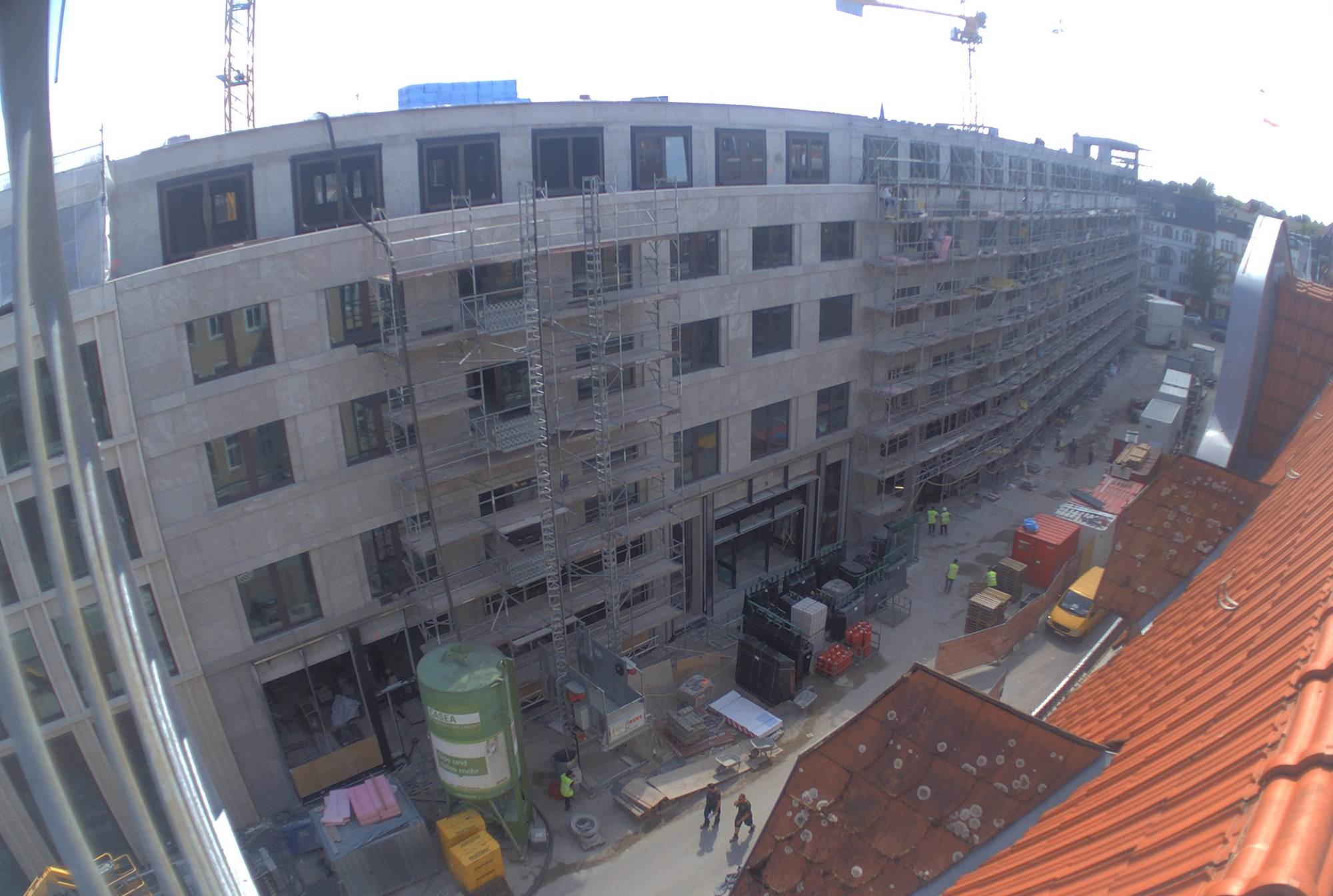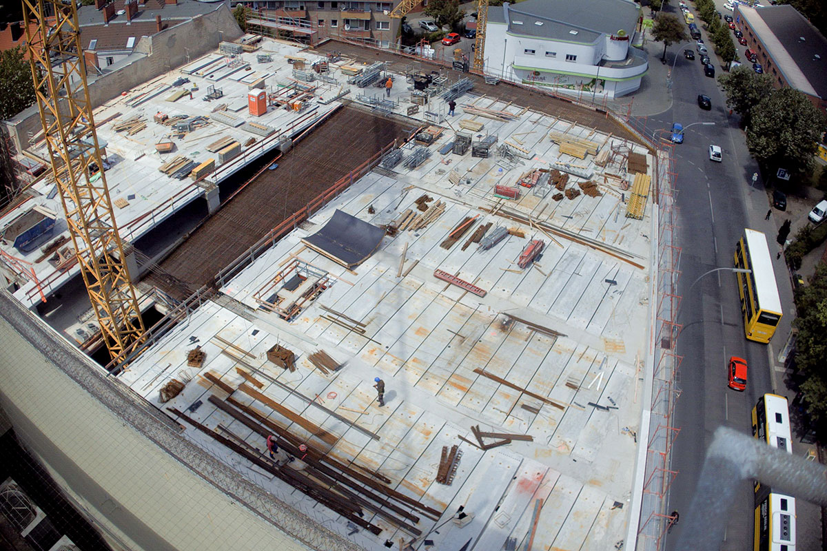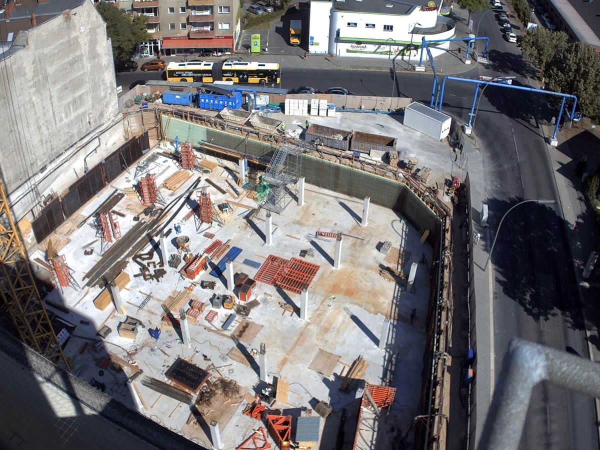 Die Verglasung der Fassade schreitet weiter voran und die ersten Maurerarbeiten beginnen im Untergeschoss. Die Baugrube wird vom Tiefbauer an den Rohbauer übergeben, so dass dieser mit den Vorarbeiten zur Betonage der Bodenplatte beginnen kann. Im Mieterbereich Karstadt werden die ersten Rohbaumaßnahmen vorgenommen, die Außenwände an der Nordfassade gemauert und die Betonfläche auf dem Dach wird saniert und abgedichtet.